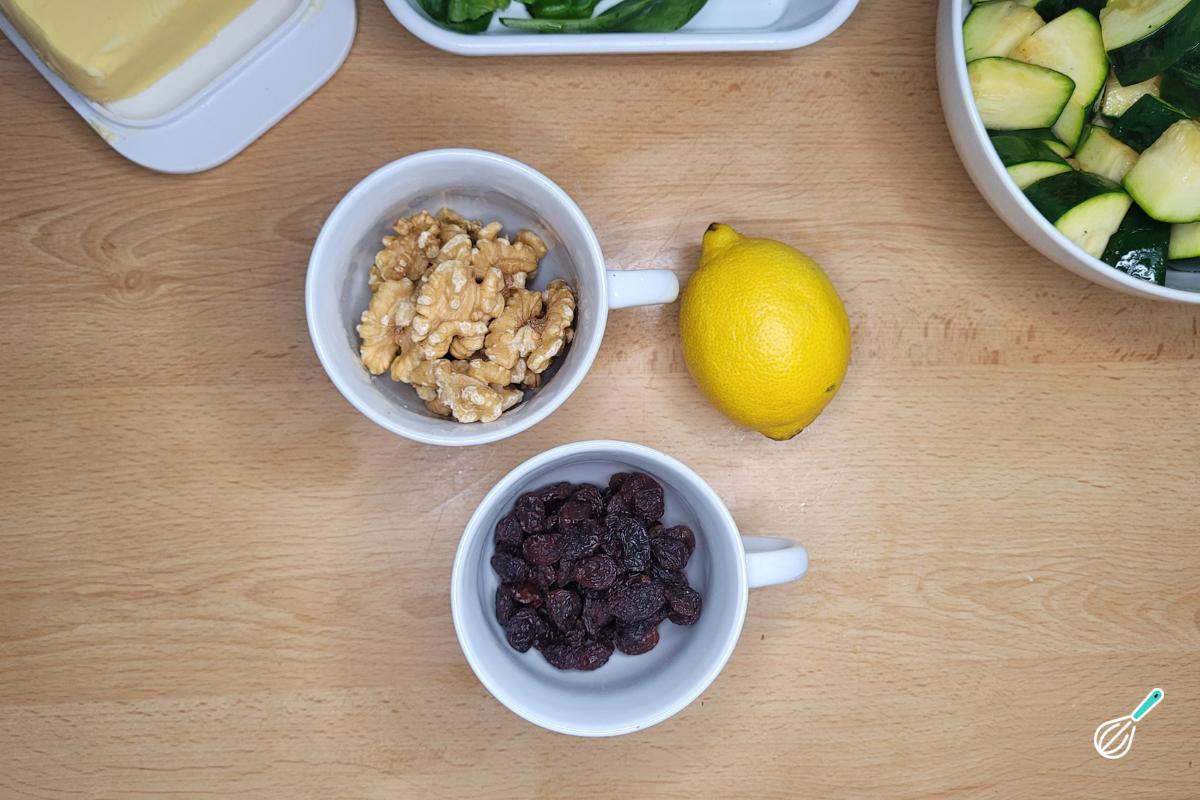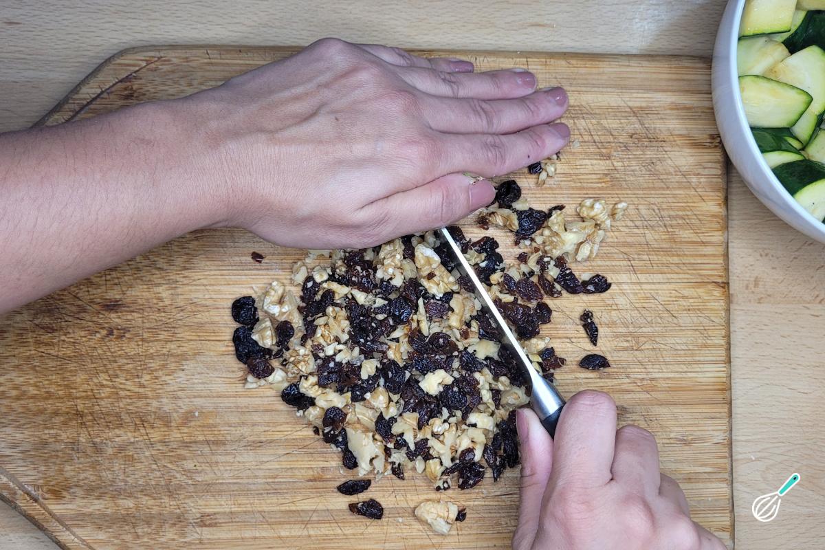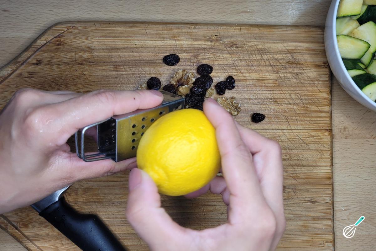 Em uma tábua, coloque as nozes, as passas e as raspas do limão siciliano.