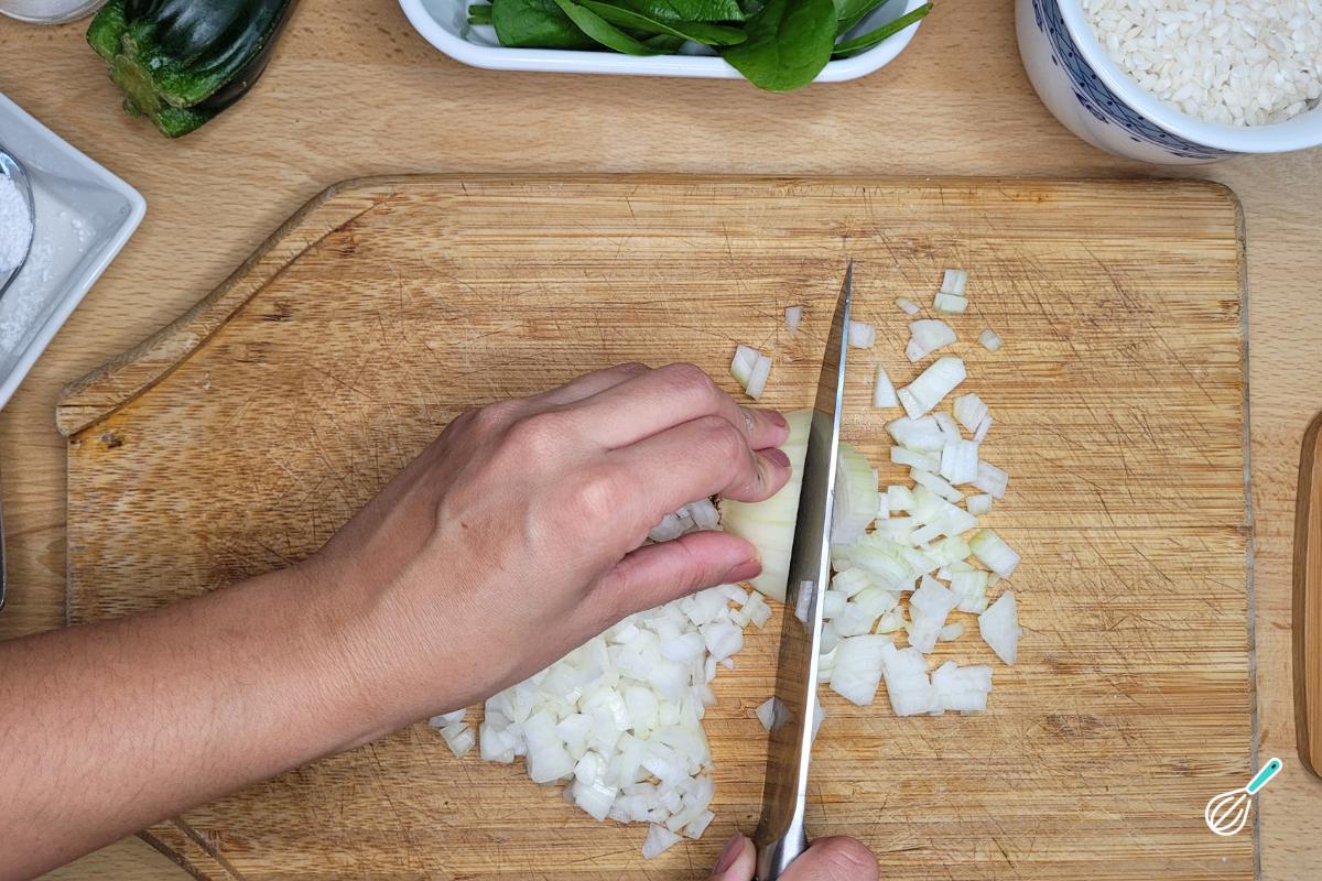Quando a abobrinha estiver dourada, reserve e na mesma frigideira coloque a cebola. Iremos retirar a abobrinha e adicionar apenas no final para que ela ainda tenha uma textura. Se deixar a abobrinha cozinhando junto com o risoto, ela ficará muito mole.