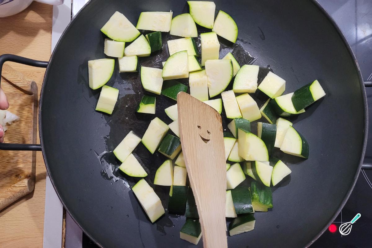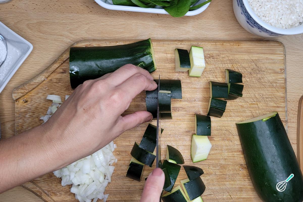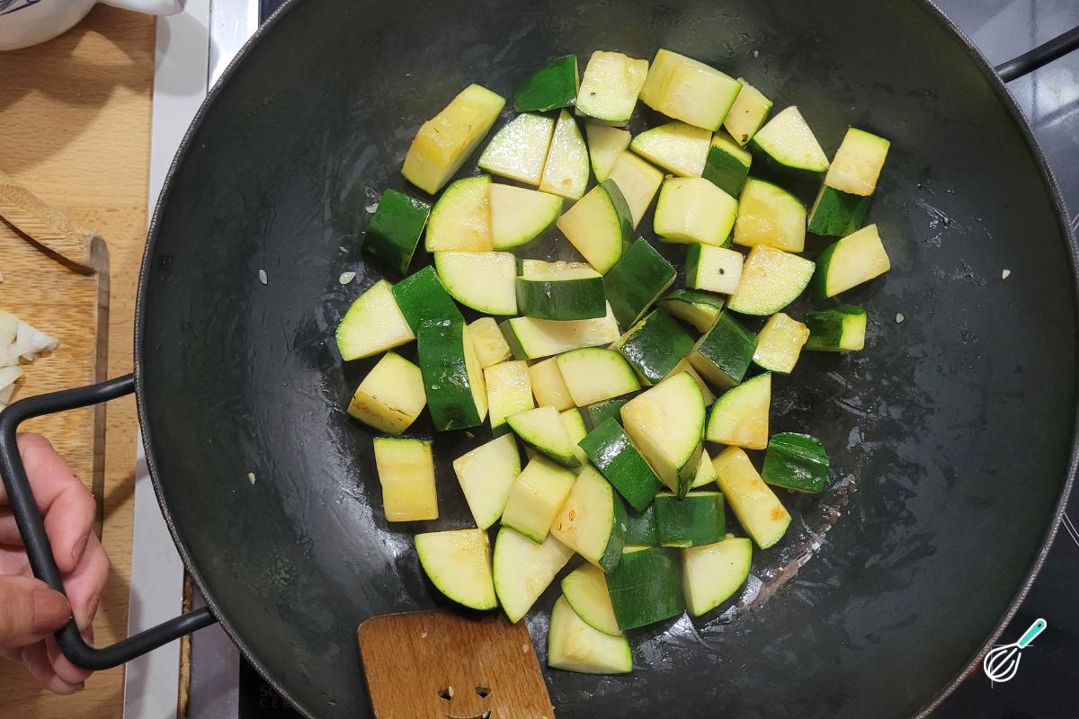 Leve os cubos de abobrinha para refogar em uma frigideira ou panela grande (onde irá preparar o risoto).