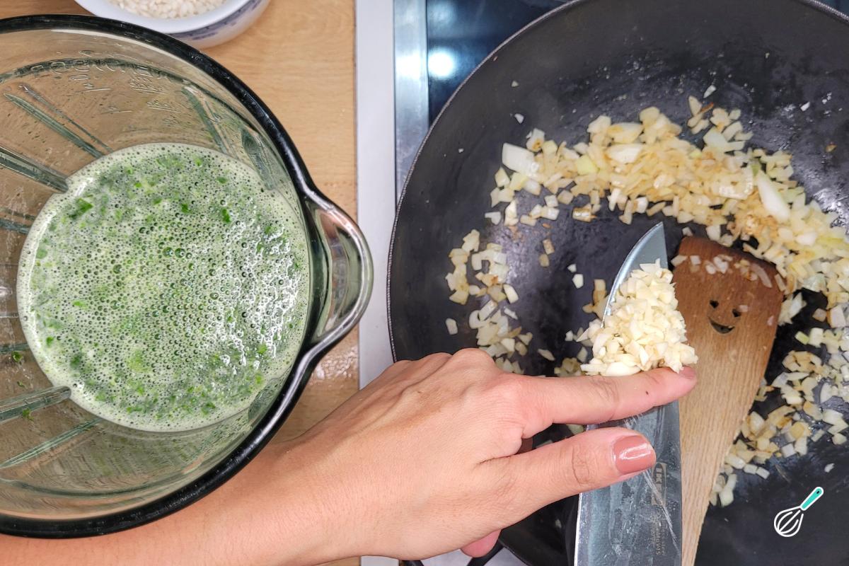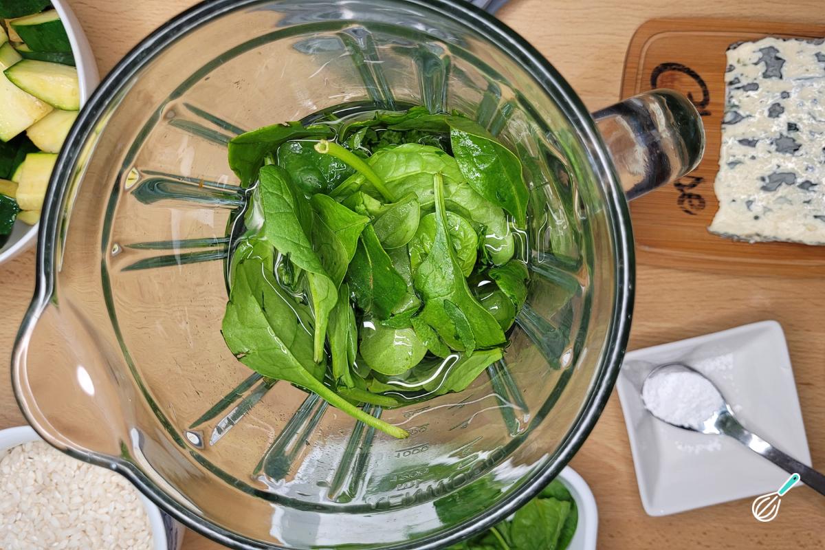 Enquanto a abobrinha doura, bata metade do maço de espinafre com 2 xícaras de água no liquidificador. Esse será o caldo do risoto. Reserve o restante das folhas de espinafre que entrarão depois para finalizar o risoto.