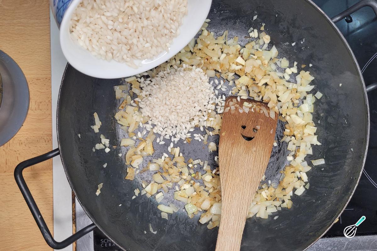 Adicione o arroz e refogue para envolver os grãos com azeite. Adicione o vinho branco e deixe em fogo alto até secar.