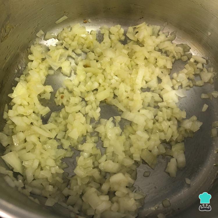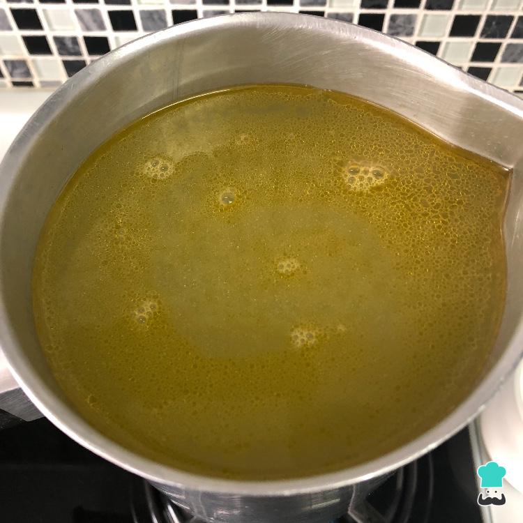 Comece aquecendo o caldo de legumes caseiro. Para fazer esse caldo basta seguir esta receita de caldo de legumes. Quando o caldo ferver, baixe o fogo.