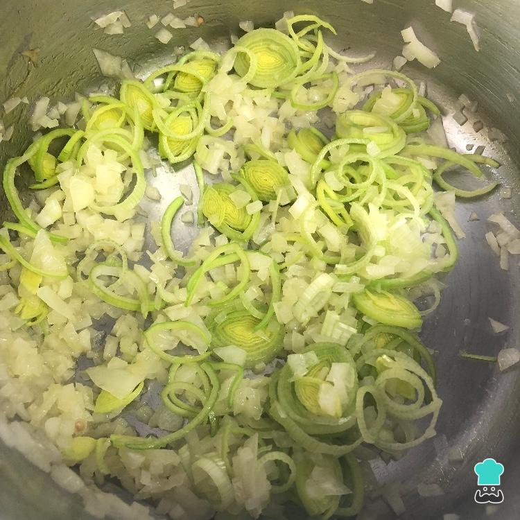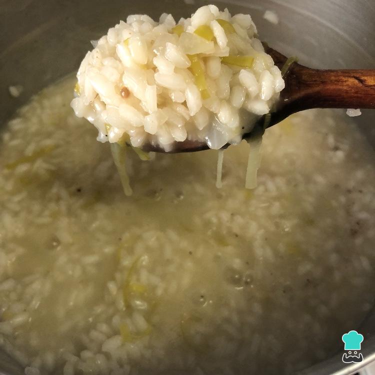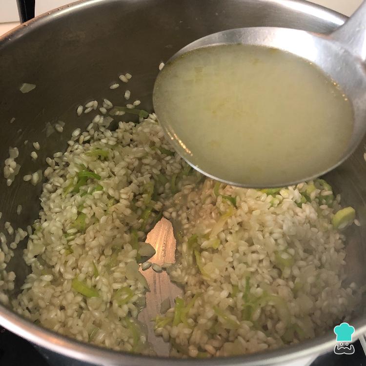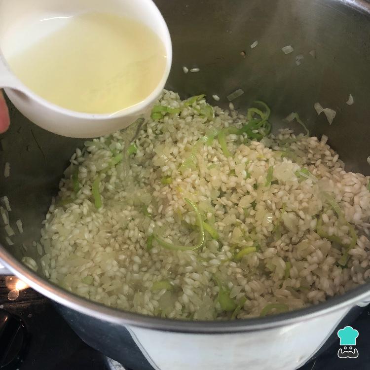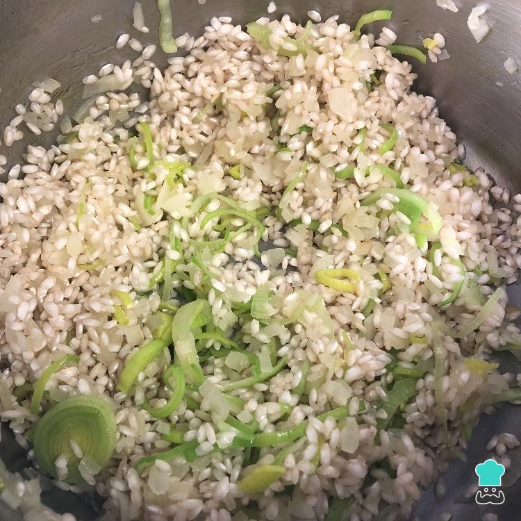 Junte o alho poró fatiado e refogue mais um pouco para continuar preparando esta receita de risoto de alho poró.