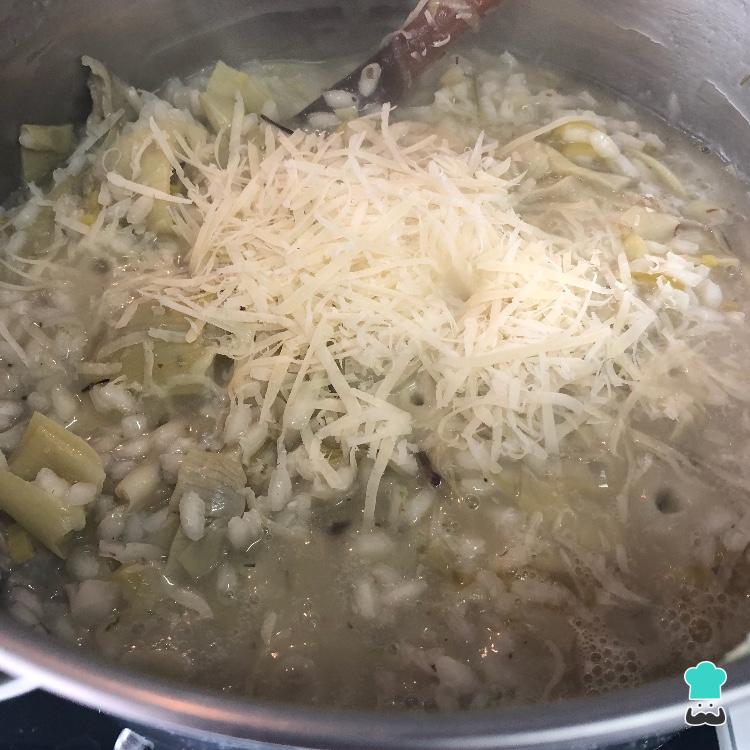 E, por último, coloque o queijo parmesão ralado na hora e misture até o risoto ficar bem cremoso. Prove e acerte os temperos, se necessário.