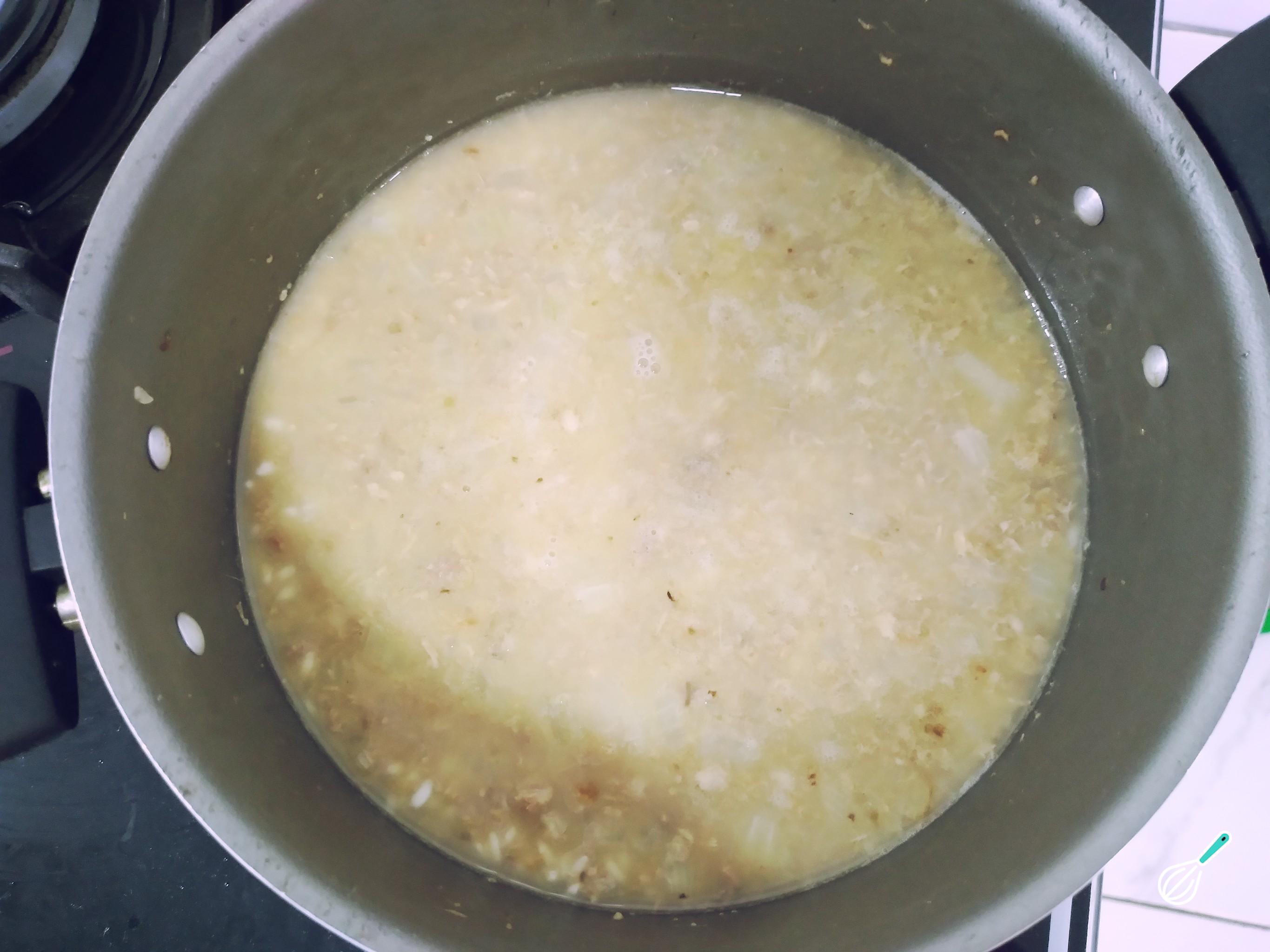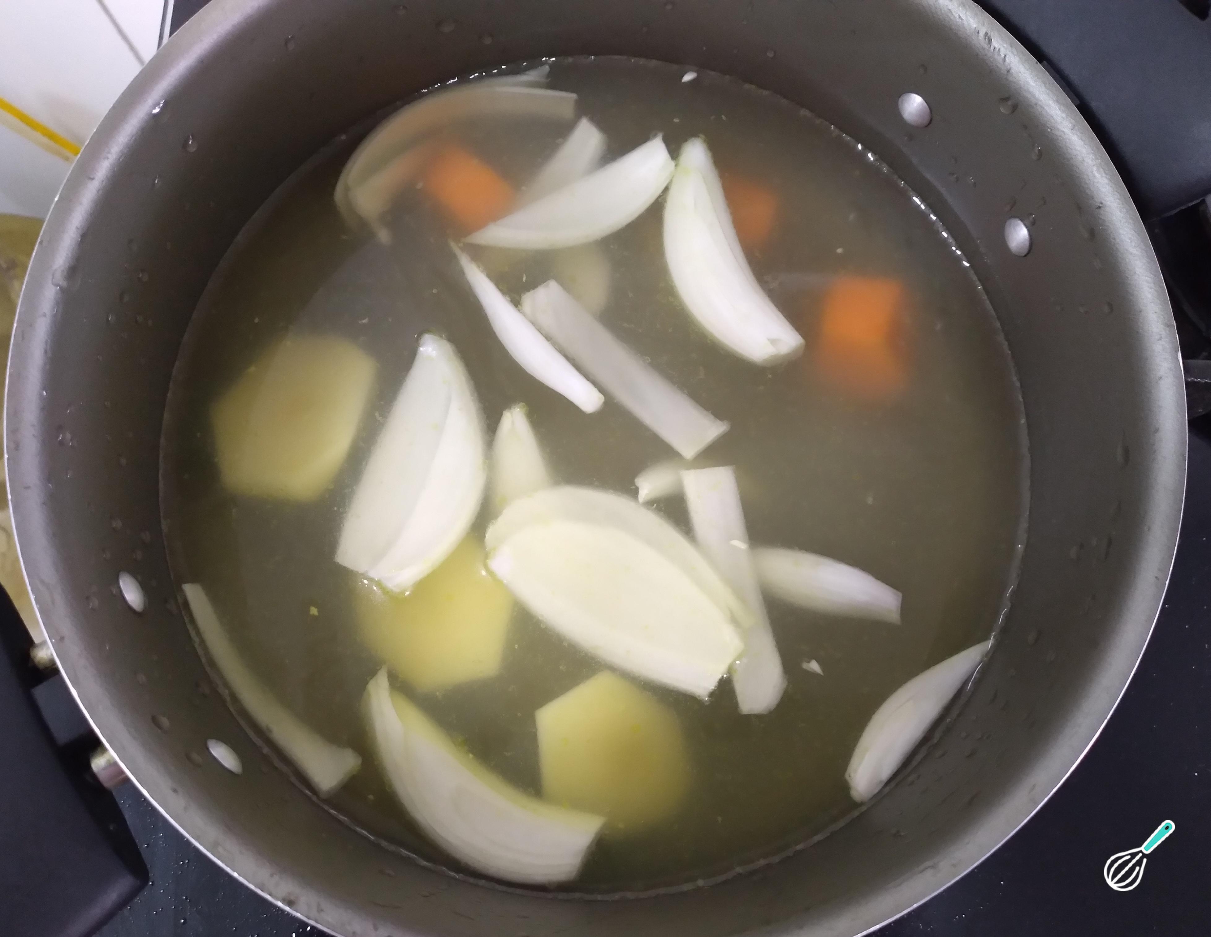 Comece preparando um caldo de legumes. Coloque a cebola, a batata e a cenoura em uma panela com água fervente. Acrescente pimenta, o sal e os temperos da sua preferência. Deixe ferver para absorver bem o sabor, depois de fervido, desligue o fogo o reserve