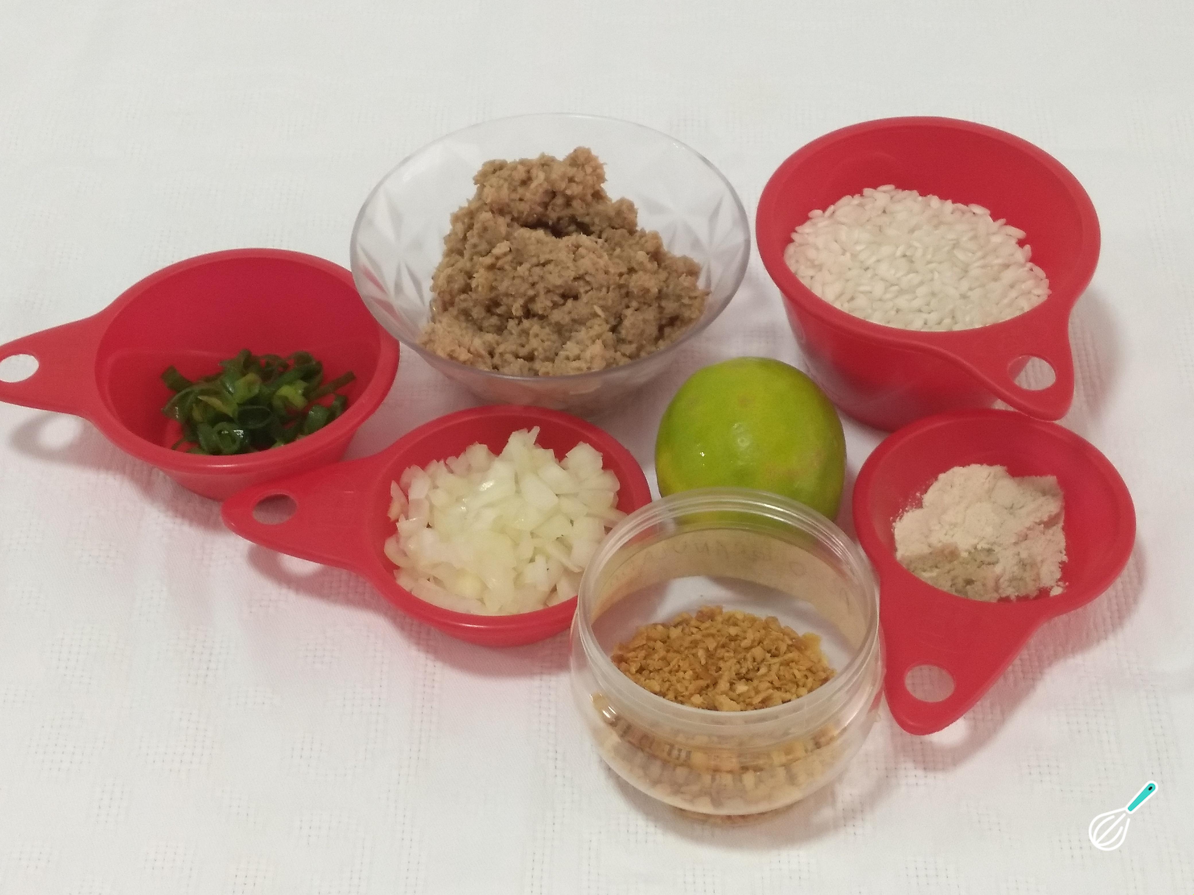 Em seguida, separe os ingredientes para o preparo do risoto. Escorra bem o atum, corte a cebola em cubinhos e a cebolinha bem picadinha. Separe os temperos e o limão.
