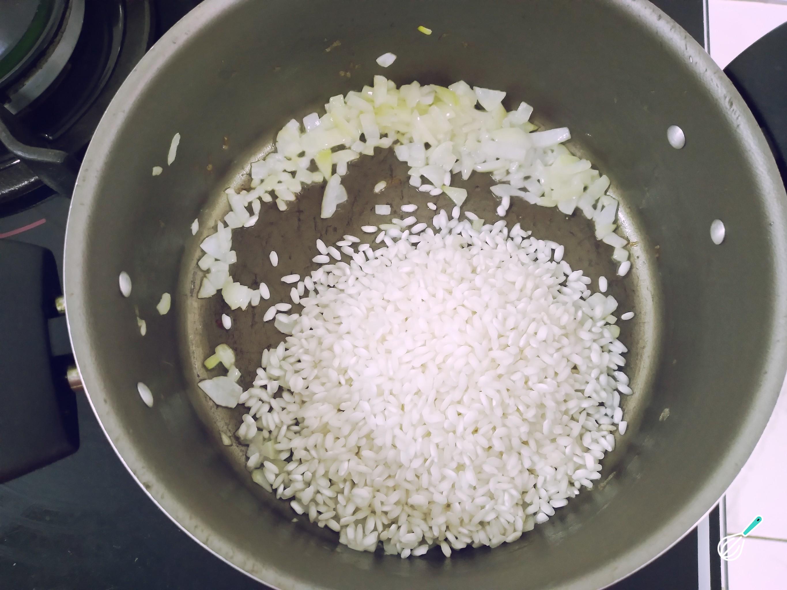Em uma panela, coloque o óleo e a cebola para refogar. Em seguida acrescente o arroz e refogue.