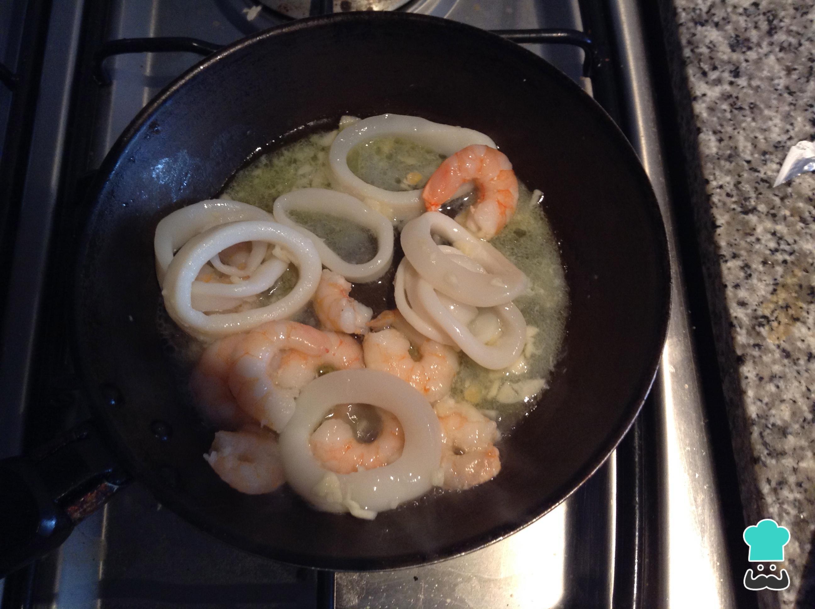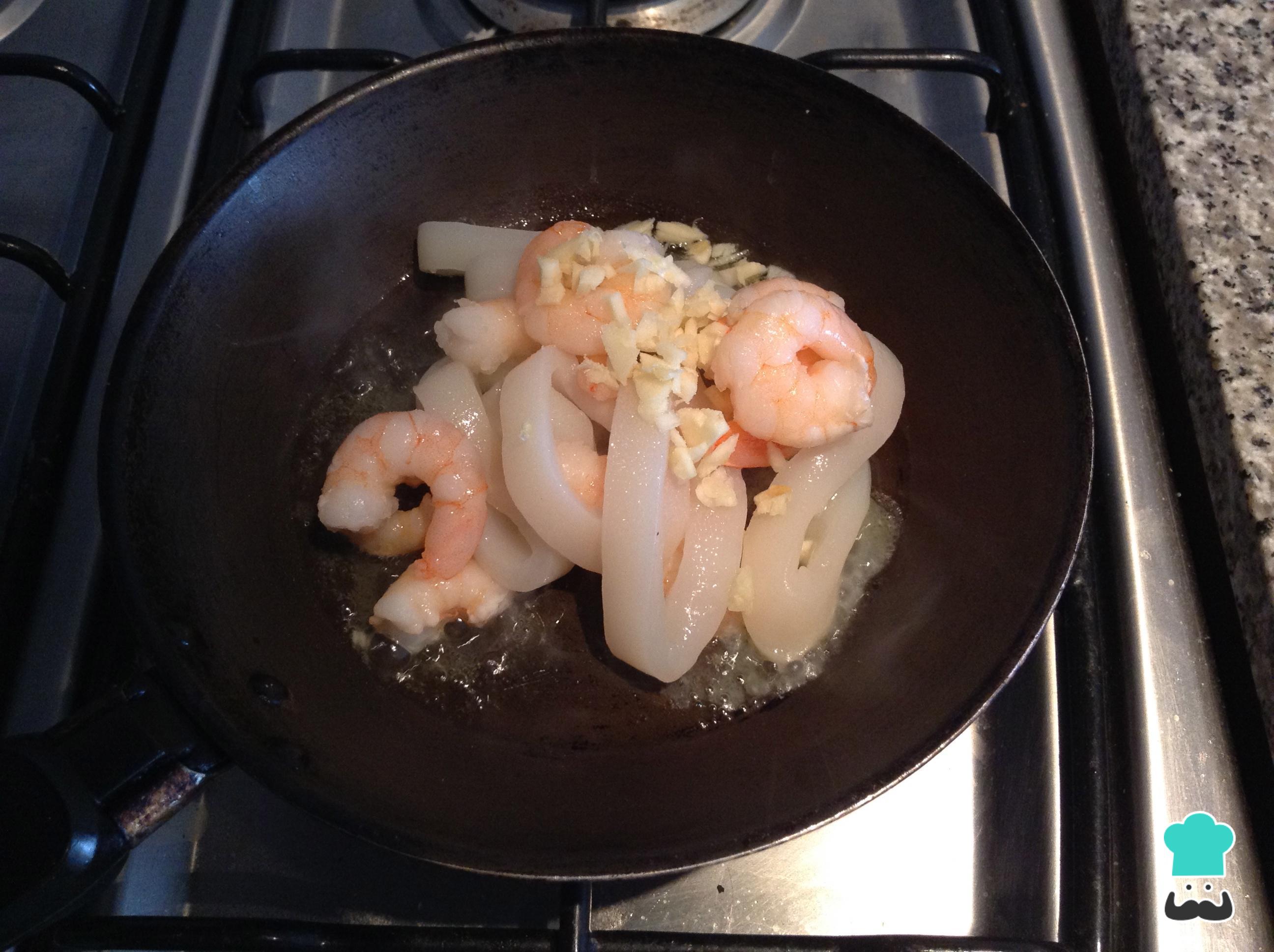 Em uma frigideira média, adicione o azeite. Uma vez quente adicione os camarões e lulas com o alho finamente picado. Deixe refogar por cinco minutos aproximadamente, acrescente sal e pimenta a gosto.
