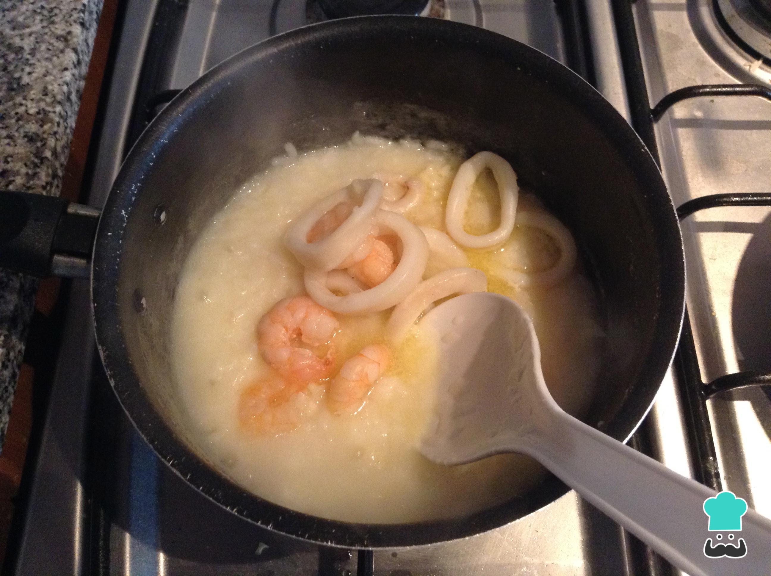 Quando o arroz estiver no ponto deve misturar o camarão e as lulas com o arroz. Mexa muito bem para que os ingredientes fiquem bem distribuídos. Por fim, adicione o creme de leite e deixe apurar por dois a três minutos.