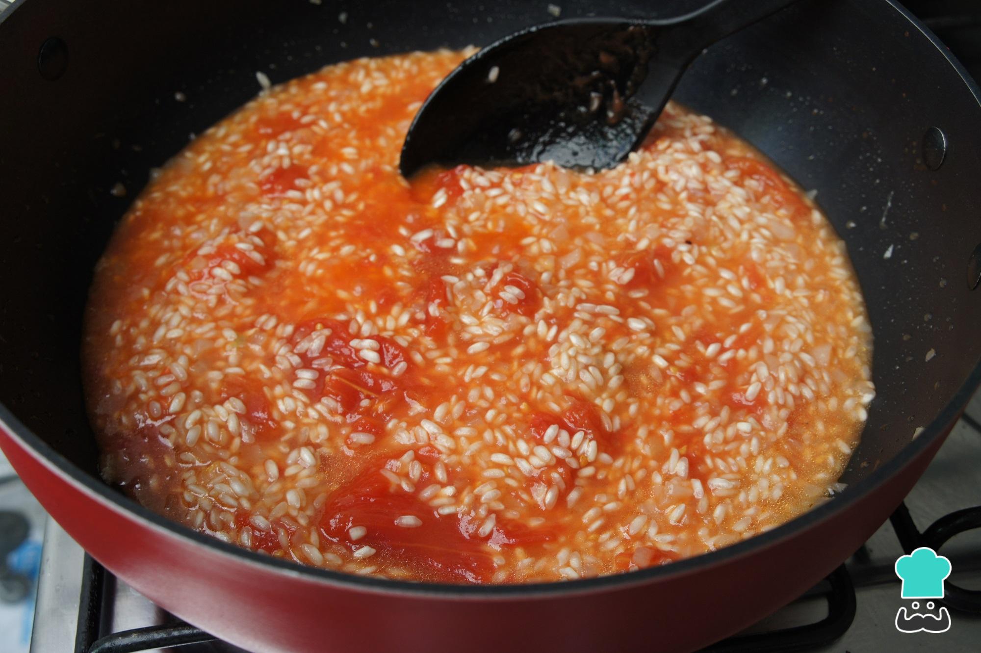 O passo seguinte do risoto de carne é adicionar o arroz. Misture para envolvê-lo bem e fritar ligeiramente. Quando os grãos estiverem transparentes, adicione o tomate picado finamente, o extrato e um pouco de caldo de carne ou água.