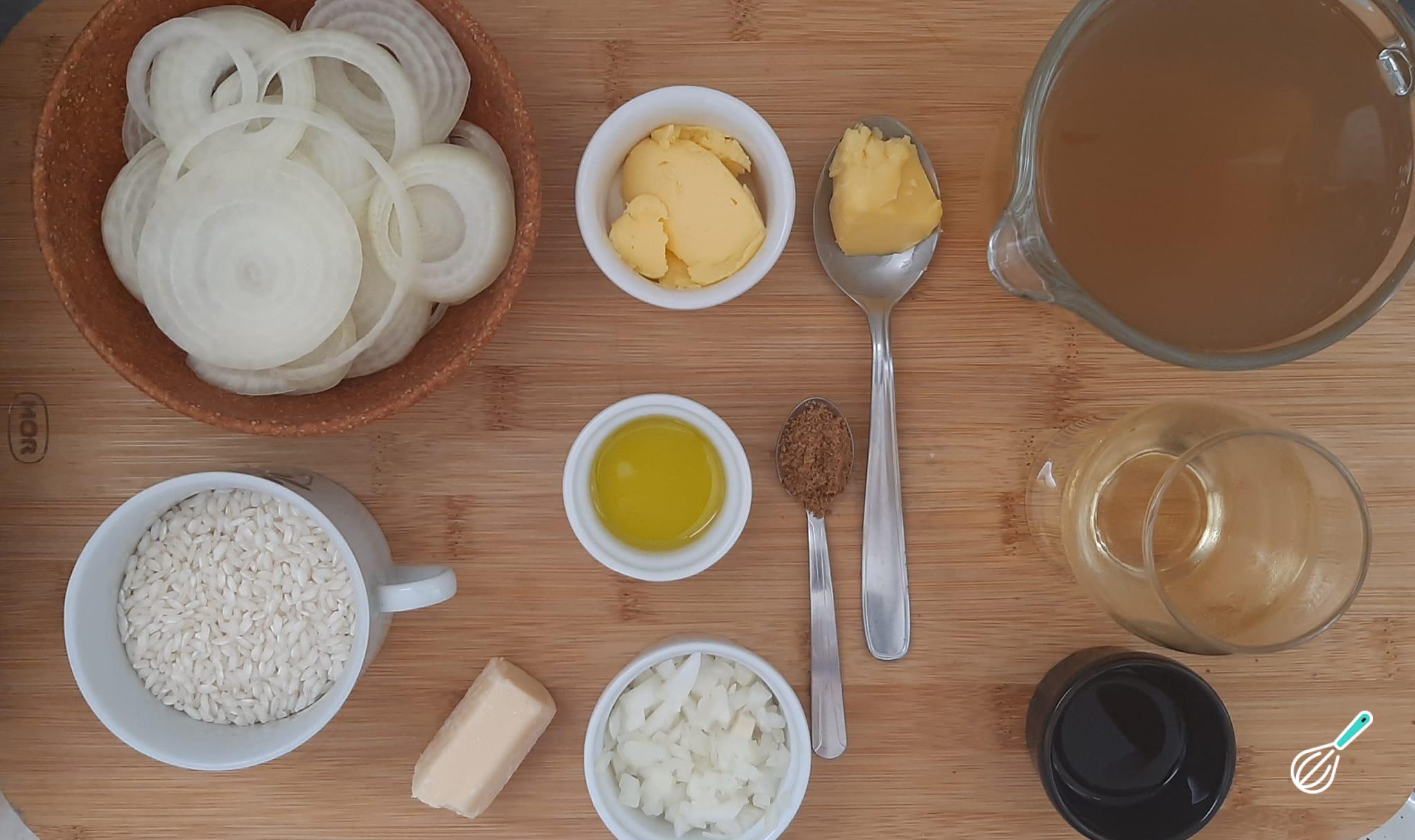 Separe os ingredientes necessários para preparar esta receita de risoto de cebola caramelizada.