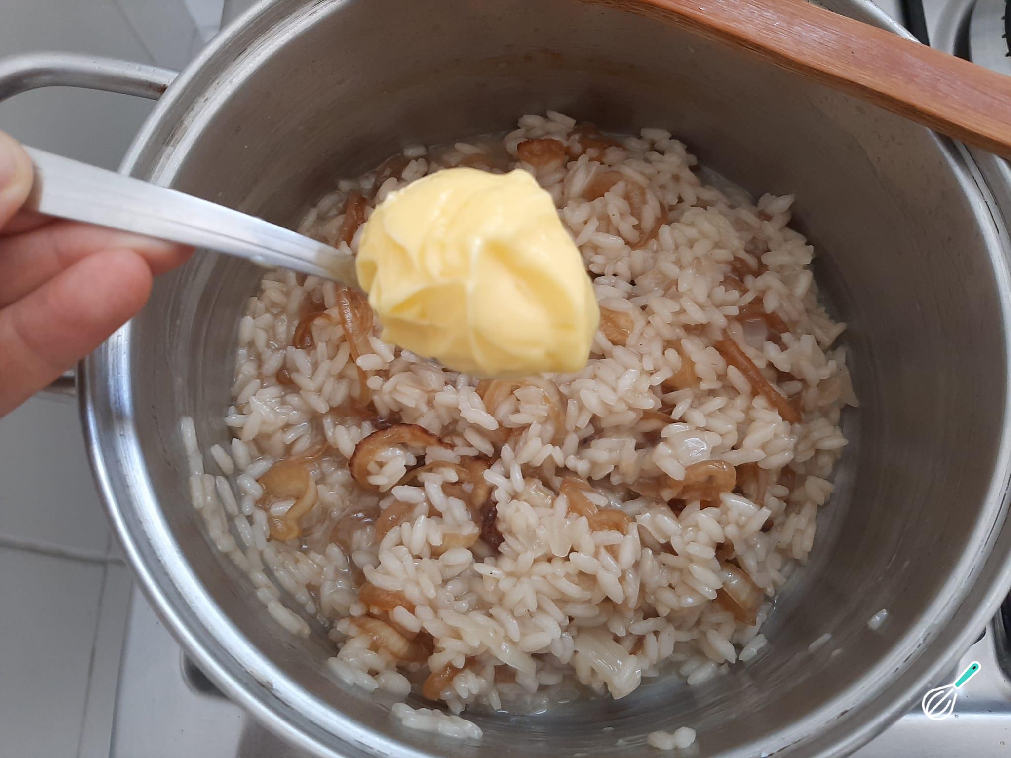 Com o risoto cozido, desligue o fogo e acrescente a cebola caramelizada, misturando bem. Finalize com manteiga gelada para deixar o risoto com brilho.