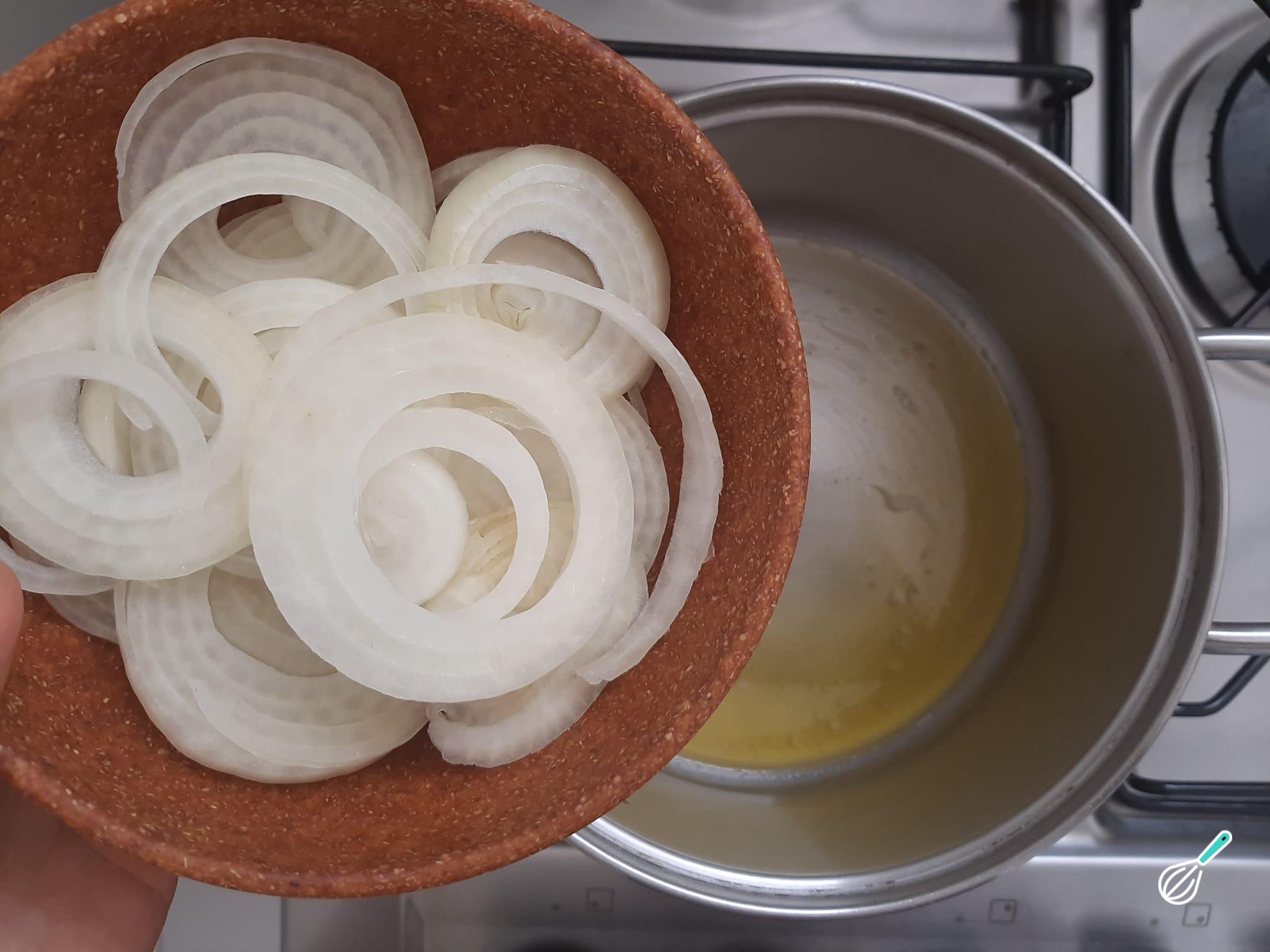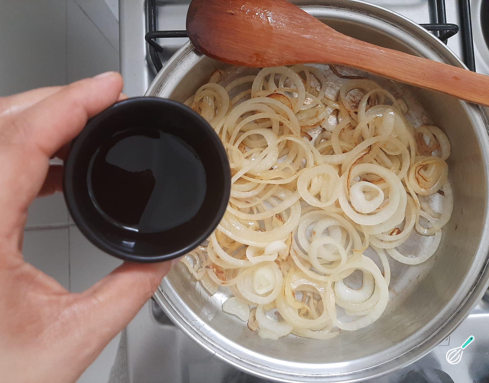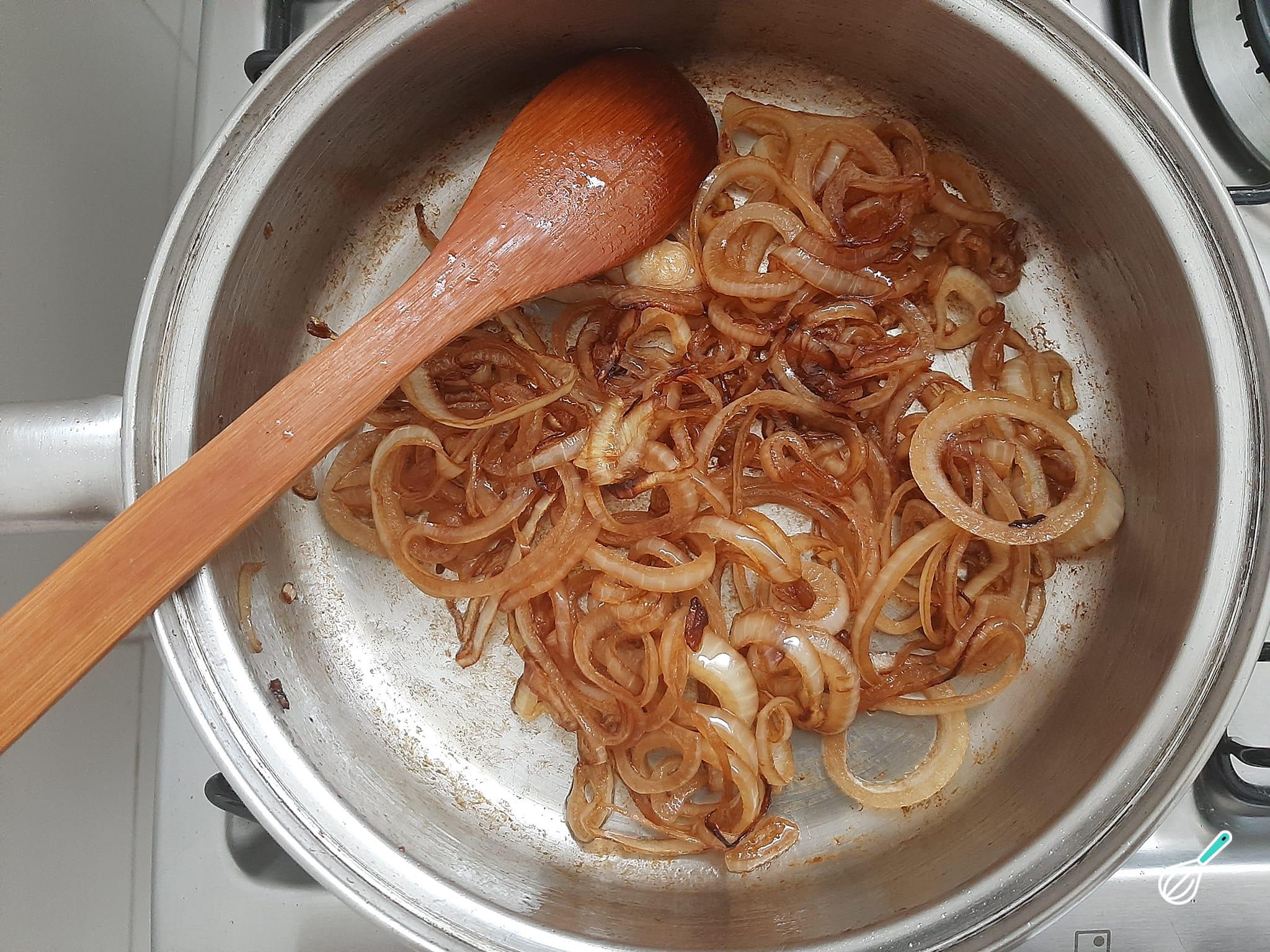 Junte as rodelas de cebola e deixe-as refogando até dourarem levemente.