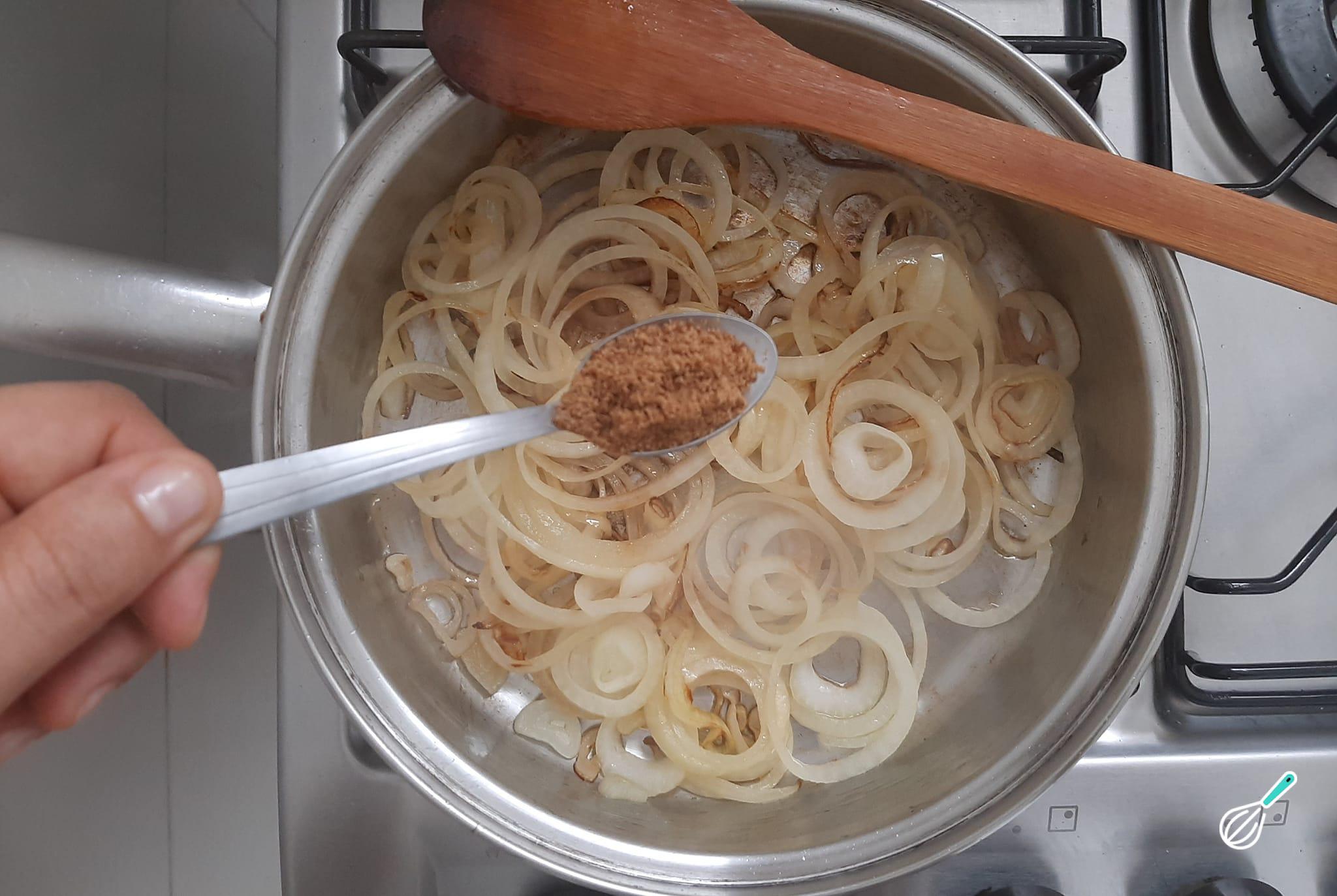 Acrescente açúcar mascavo e misture com as rodelas de cebolas.