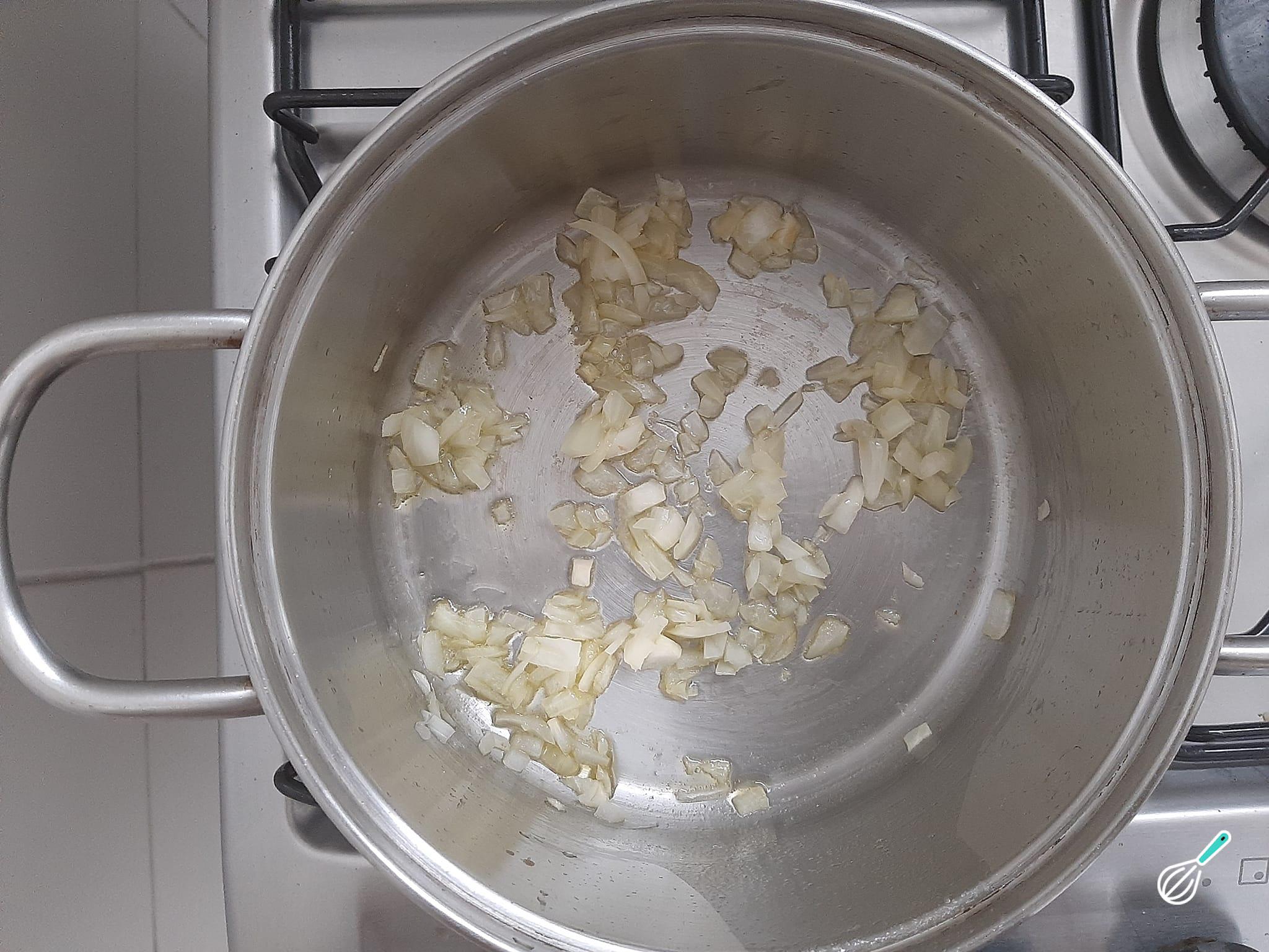 Numa panela, aqueça o azeite de oliva restante e refogue a cebola picada até que ela fique transparente.