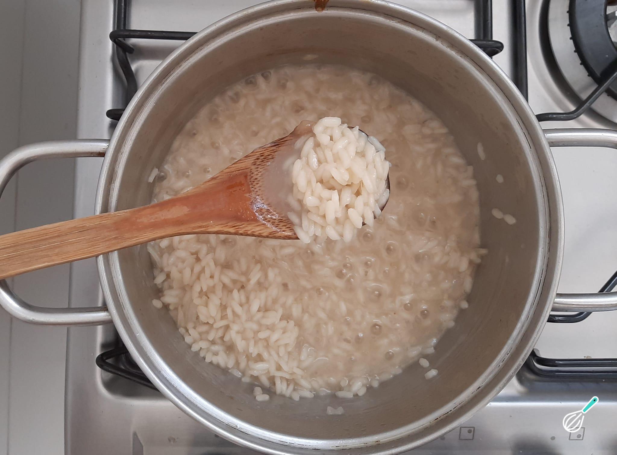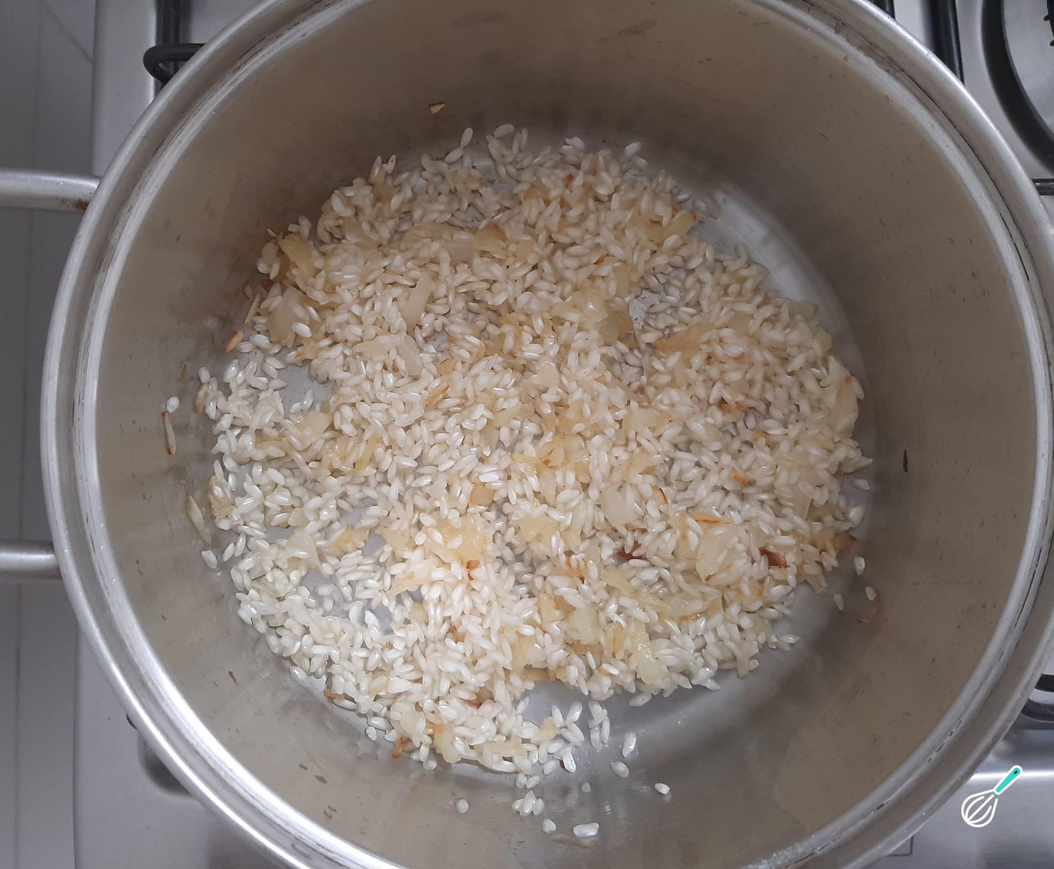 Acrescente o arroz arbóreo e refogue junto com a cebola.