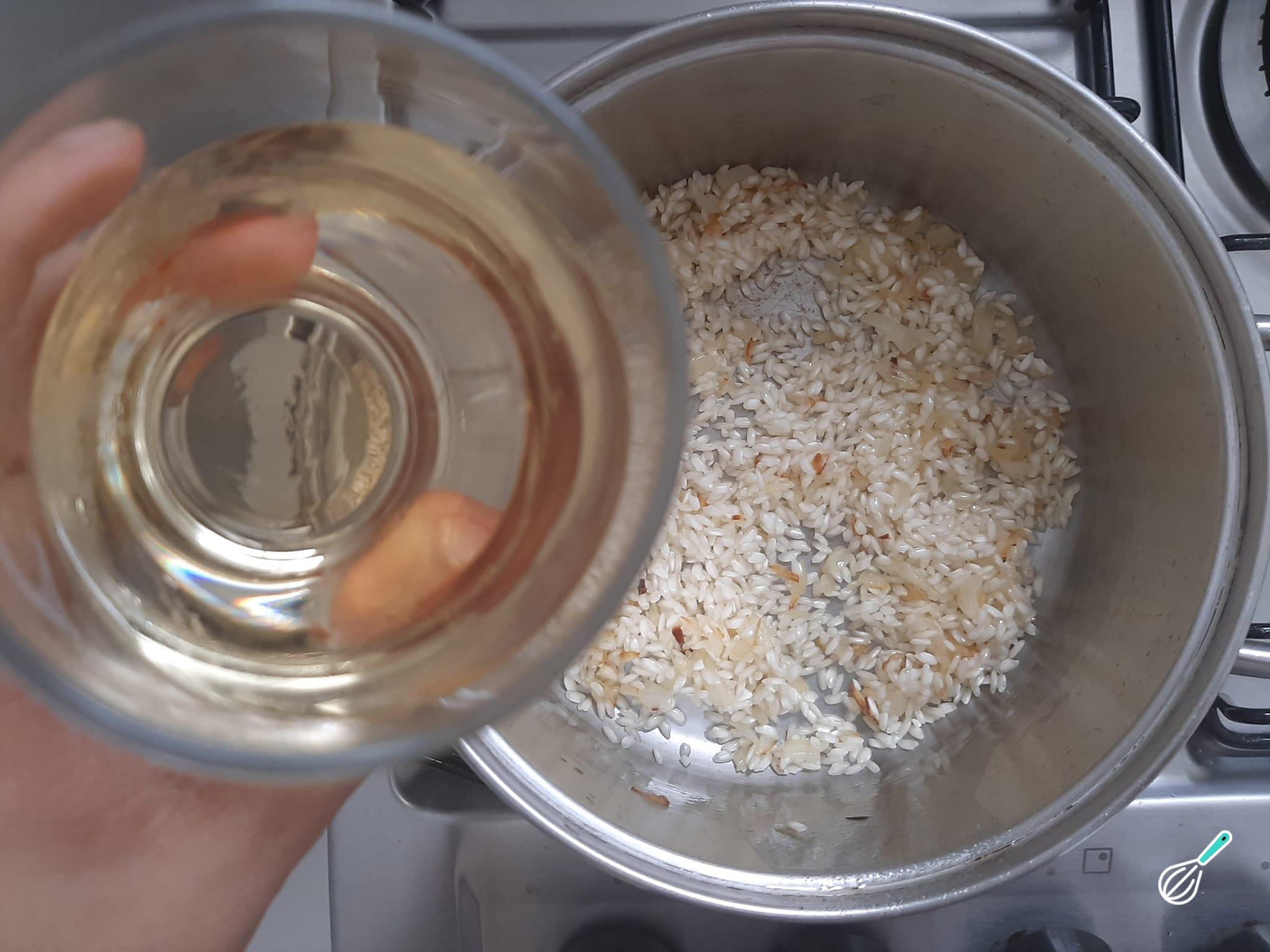 O vinho branco seco faz toda a diferença nesta receita, pois evapora rápido e garante um perfume maravilhoso ao risoto.