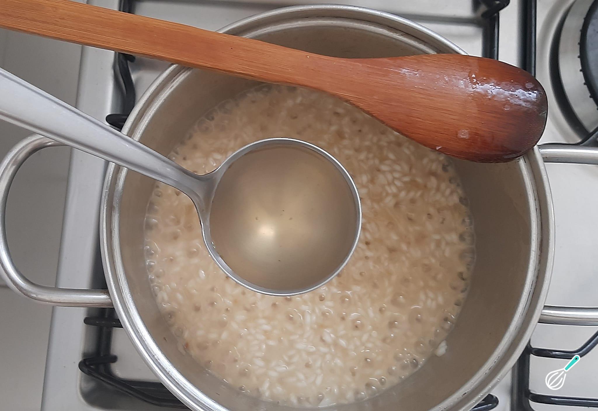 Dica: Dica: a primeira concha de caldo deverá ser generosa para cobrir todo o arroz e deixar que ele vá cozinhando lentamente.