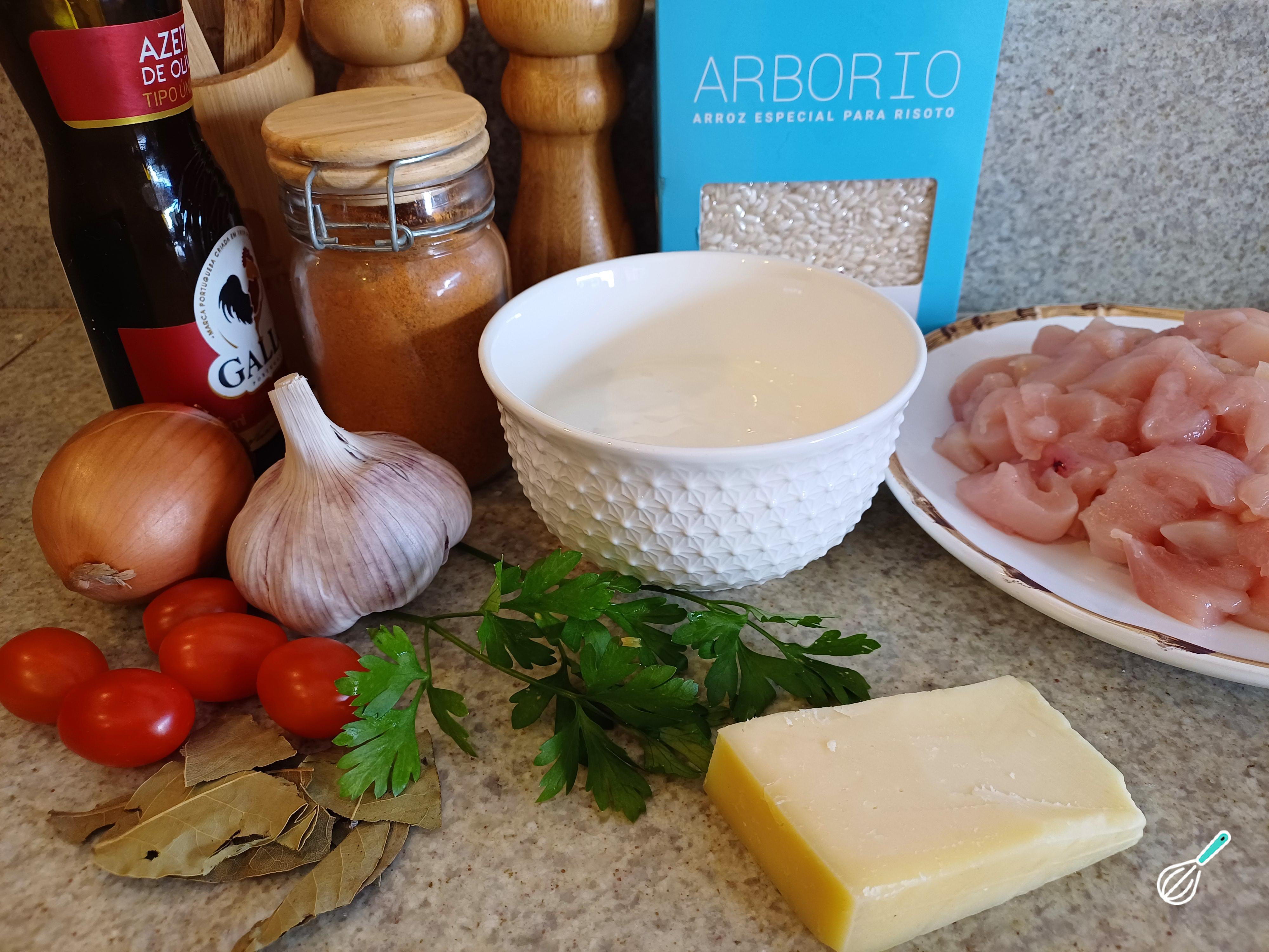 Comece separando os ingredientes e utensílios necessários para o preparo da receita de risoto de frango com creme de leite.