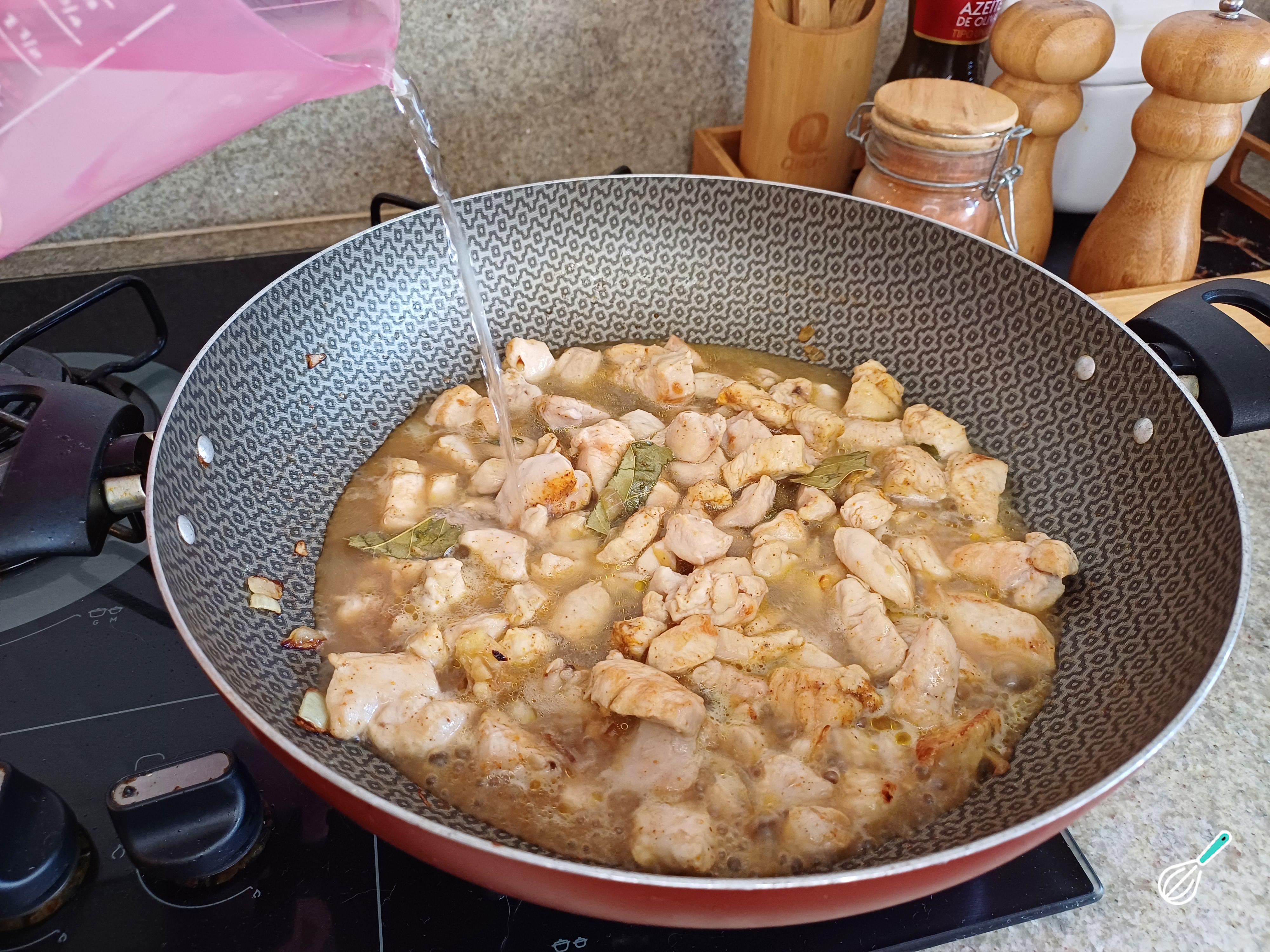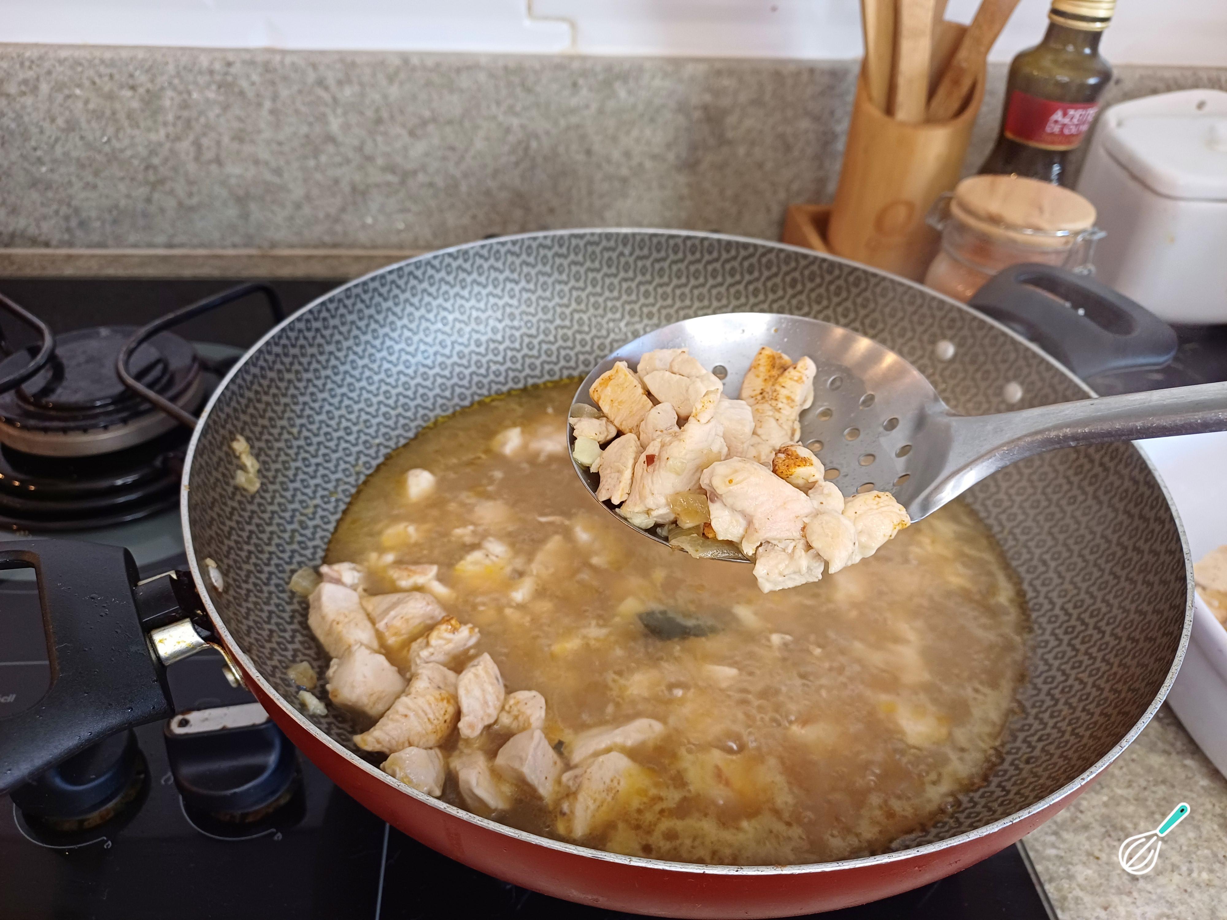 Retire todo o caldo e reserve, e na mesma panela deixe o frango refogando em fogo baixo até dourar bem.