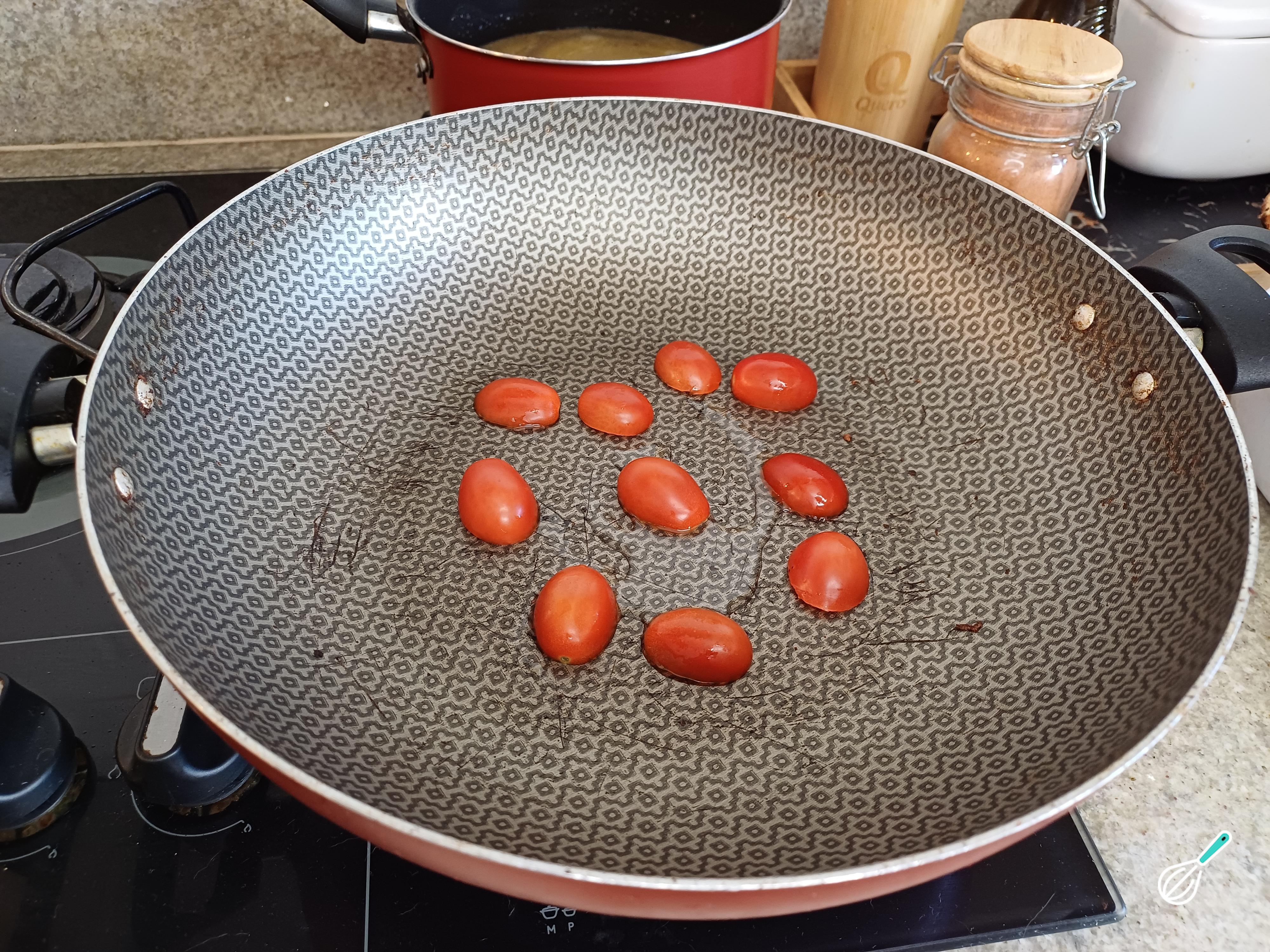 Em uma frigideira, grelhe os tomates cereja cortados ao meio com um fio de azeite, até ficarem levemente dourados. Reserve.