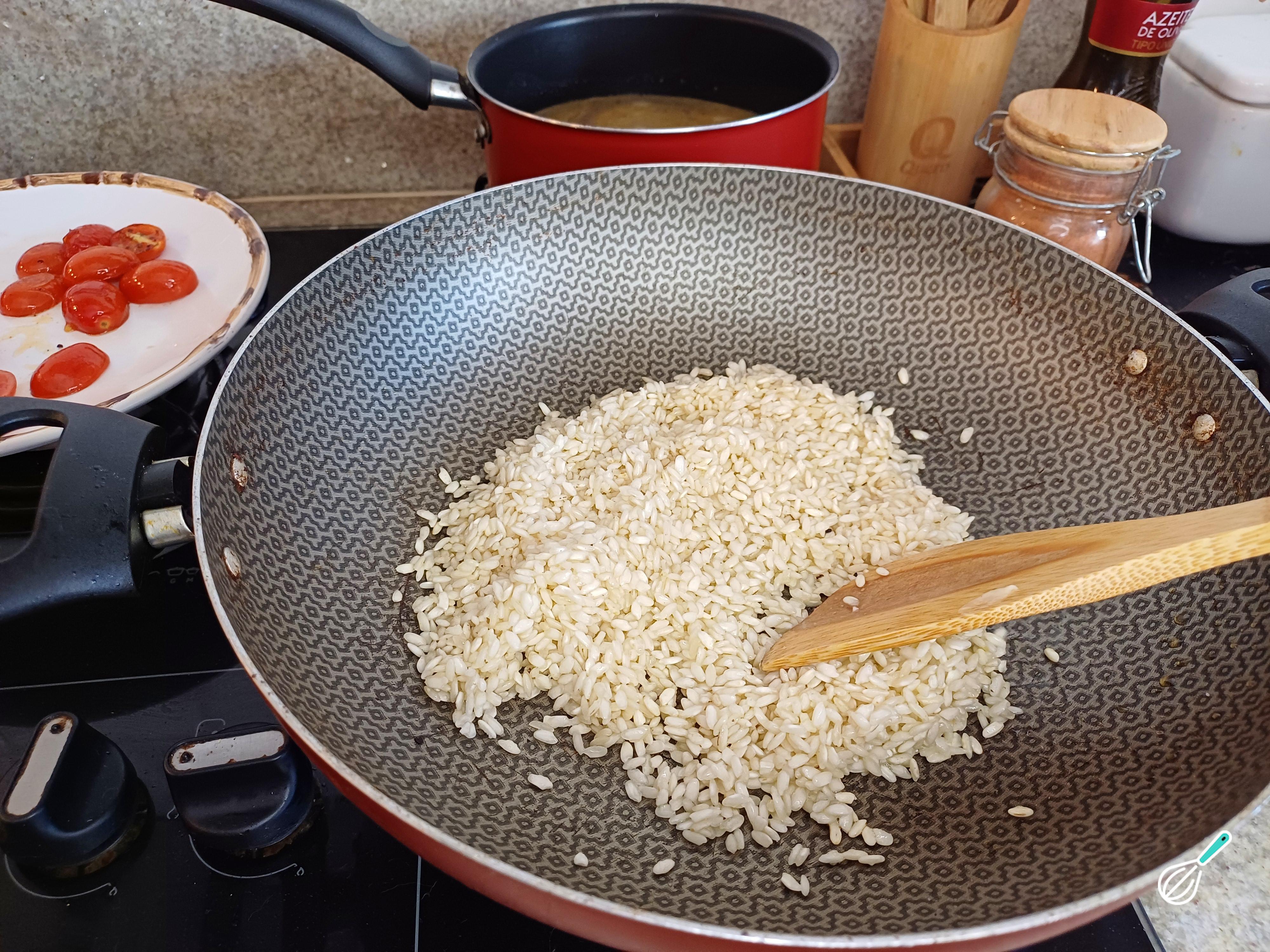 Em outra panela grande aquecida, adicione uma colher de azeite e logo após o arroz arbóreo, mexendo bem até começar fritar.