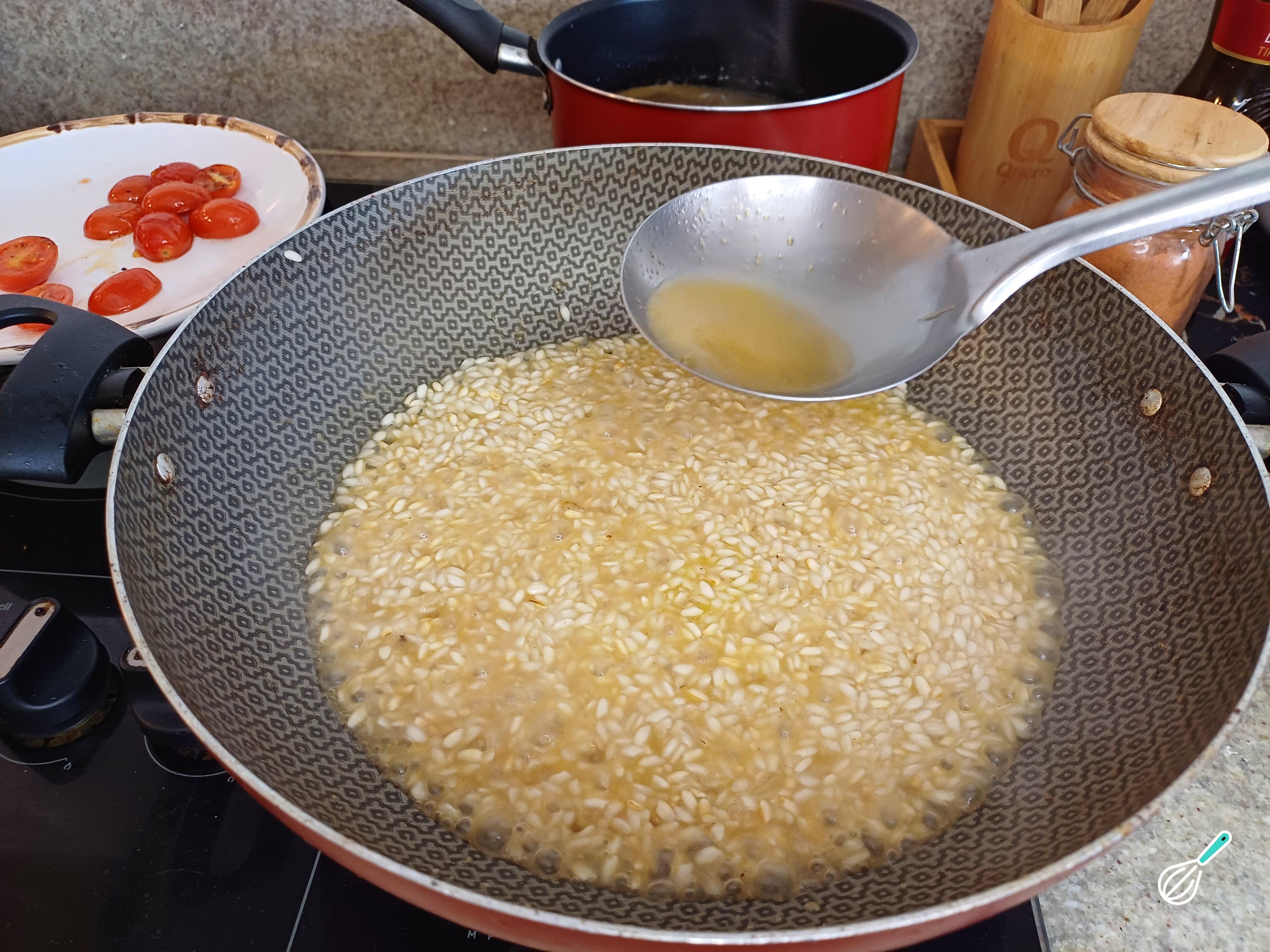 Dica: Esse processo fará com que o arroz arbóreo cozinhe lentamente e solte o amido, trazendo cremosidade ao risoto.