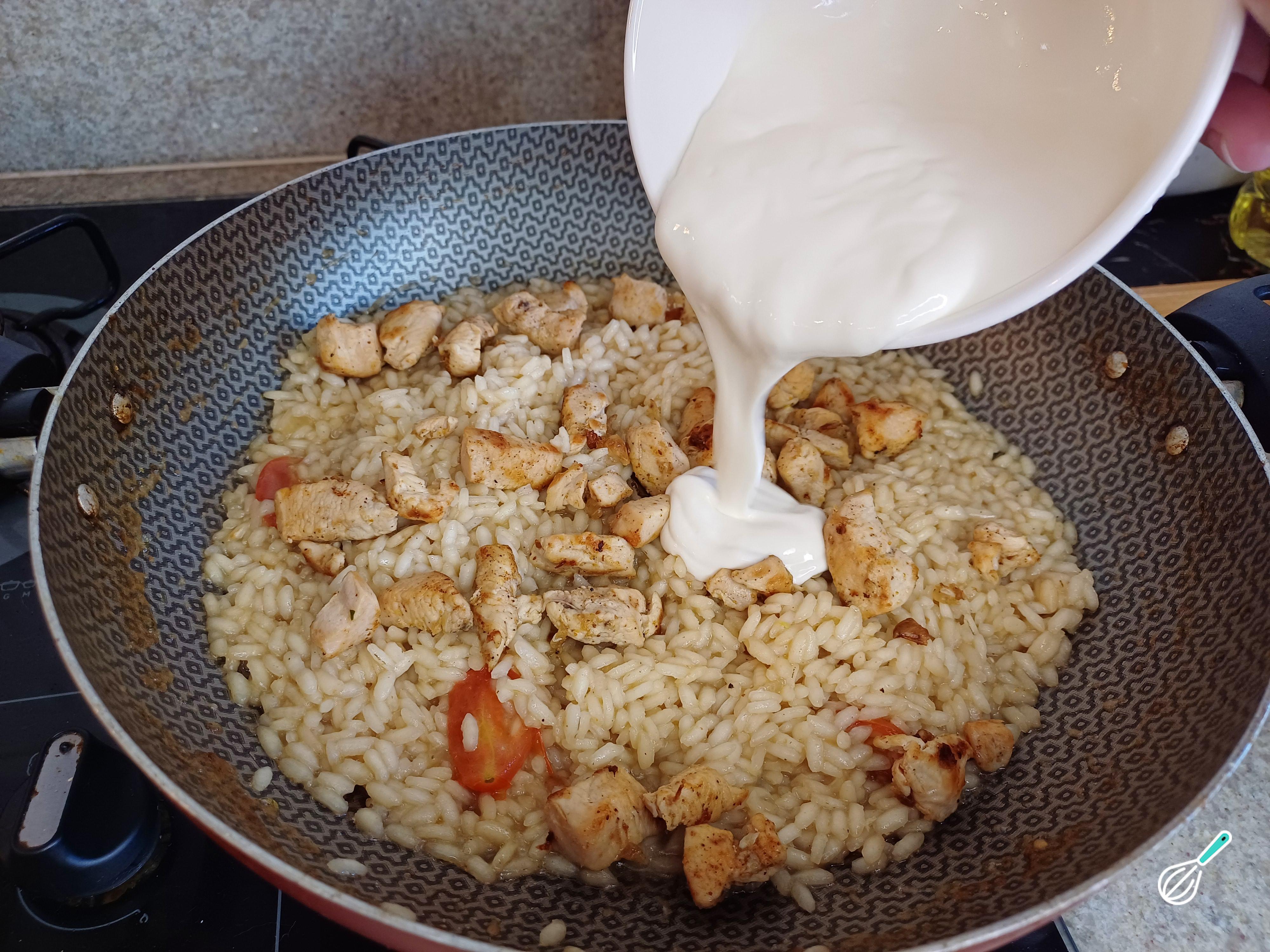 Quando terminar o cozimento do arroz, adicione os tomates grelhados, os cubos de frango refogados, e o creme de leite, mexendo para misturar e agregar o sabor de todos os ingredientes.