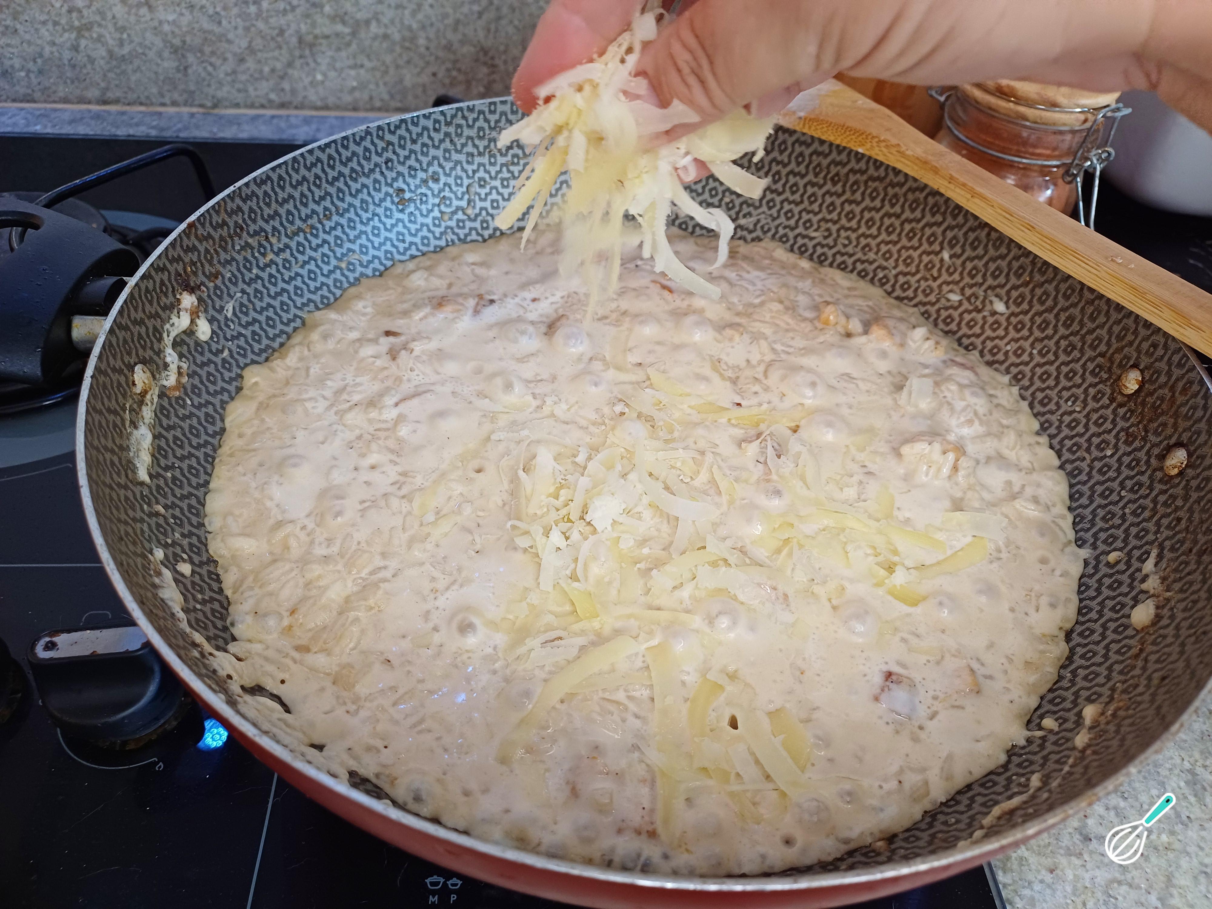 Desligue o fogo, polvilhe parmessão ralado, deixe derreter e use uma colher apenas para incorporar.