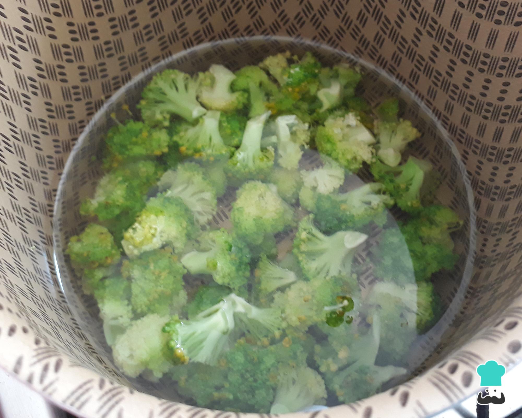 Cozinhe o brócolis picadinho por 5 minutos, ou até ficar no ponto al dente. Escorra e reserve.