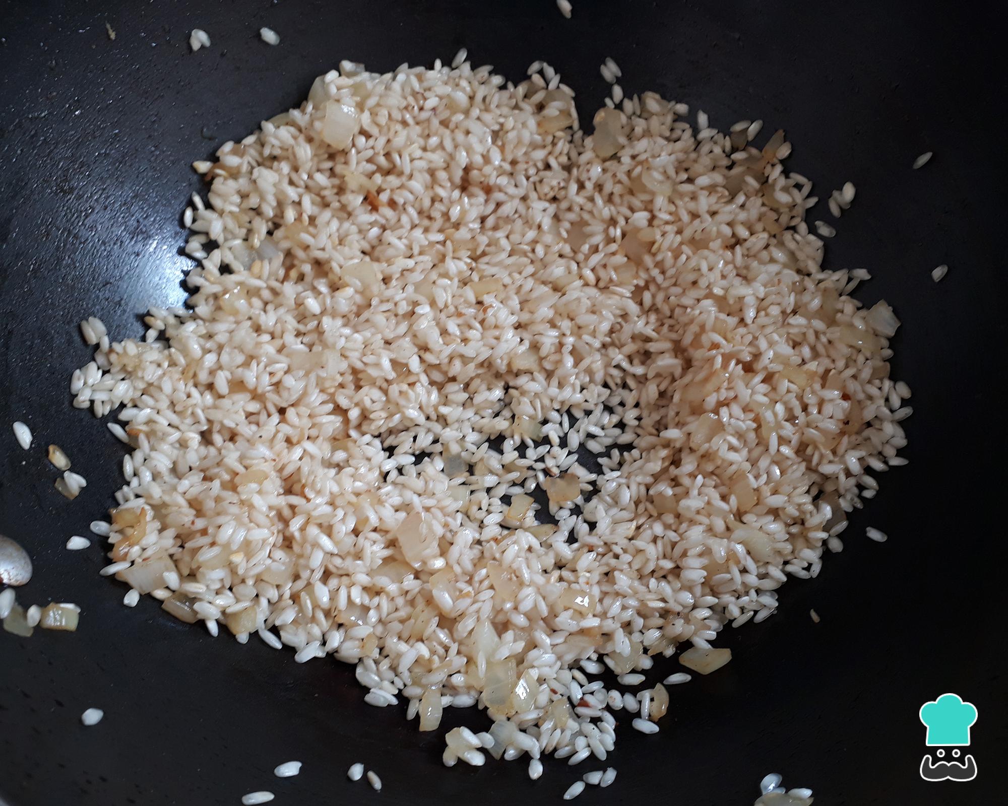 Na mesma panela, continue o preparo do risoto. Acrescente a cebola e refogue bem. Na sequência, junte o arroz arbóreo e refogue mais alguns minutos.