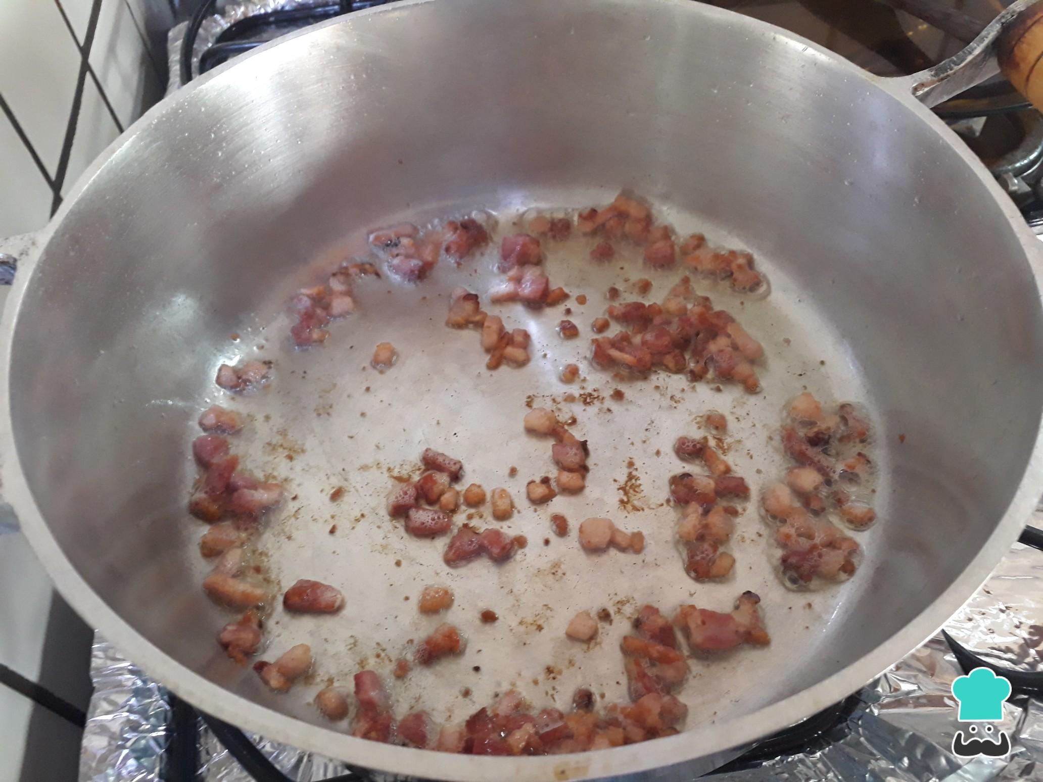 Em uma panela bem grande frite o bacon em um pouco de óleo até ficar crocante. Reserve.