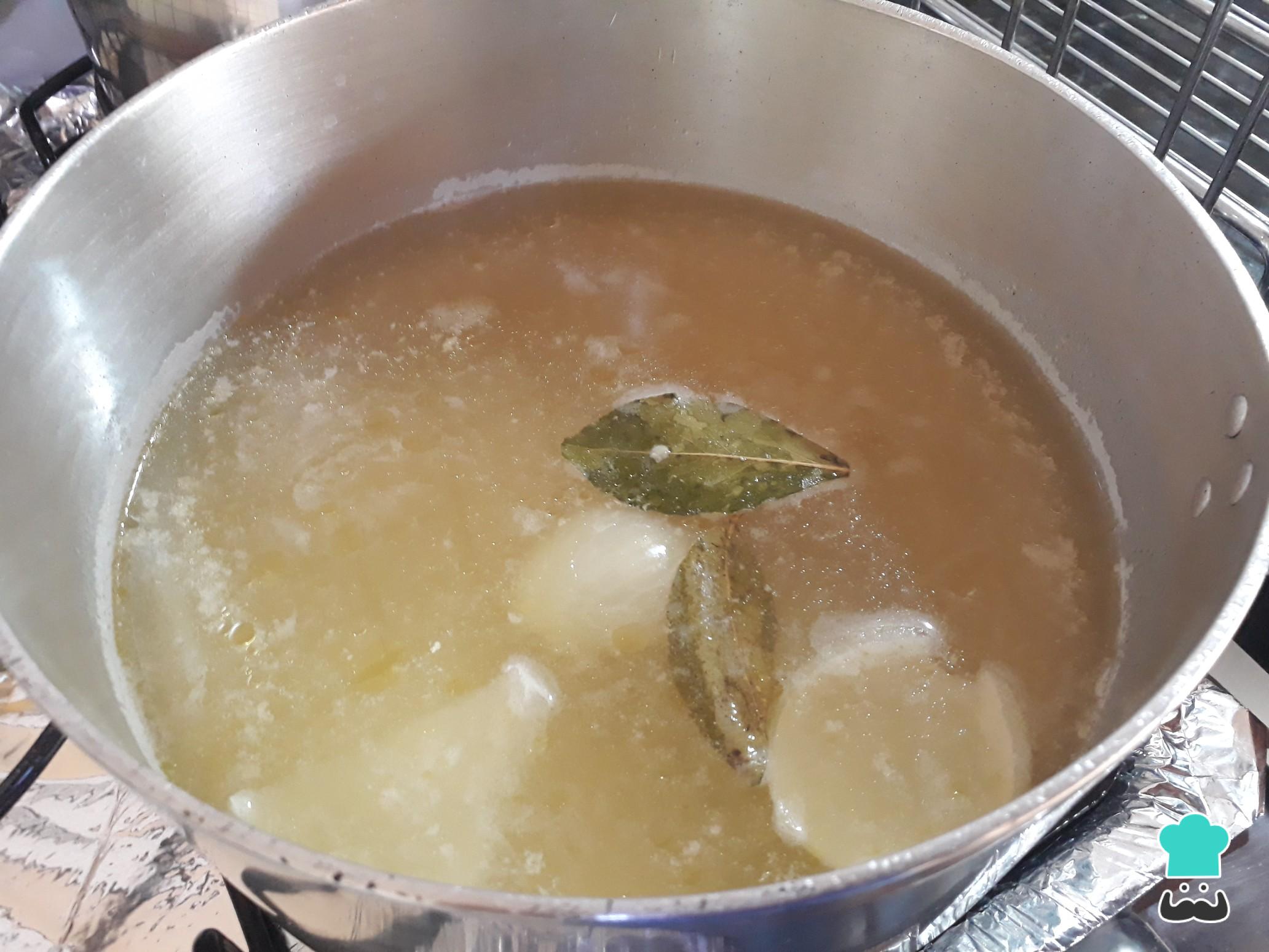 Enquanto isso, aqueça o caldo e deixe fervendo em fogo baixo.