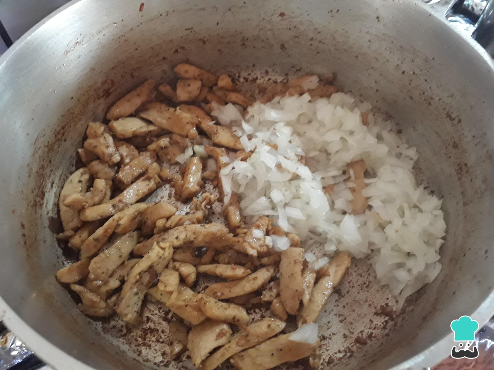 Na mesma panela da fritura do bacon, frite o frango até ficar bem dourado. Depois, acrescente a cebola e refogue bem.