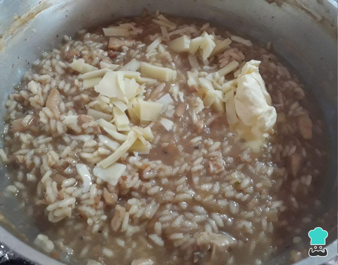 Quando o risoto estiver pronto desligue o fogo e, para finalizar, adicione uma colher de manteiga e a mussarela. Misture bem.