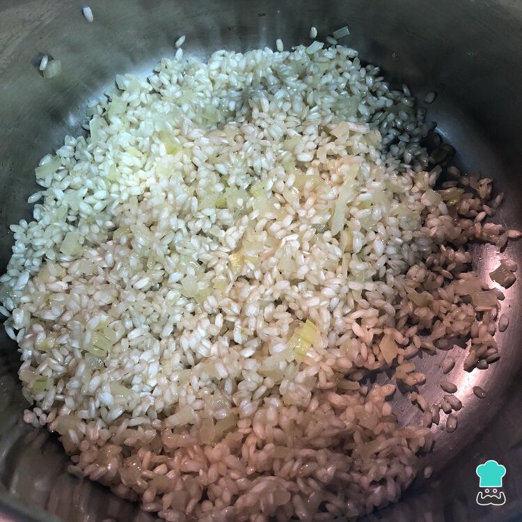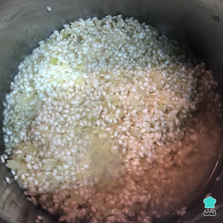 Quando a cebola estiver macia, adicione o arroz e misture bem, mexendo por 2 minutos - no final desse tempo o grão do arroz deverá estar ligeiramente transparente.