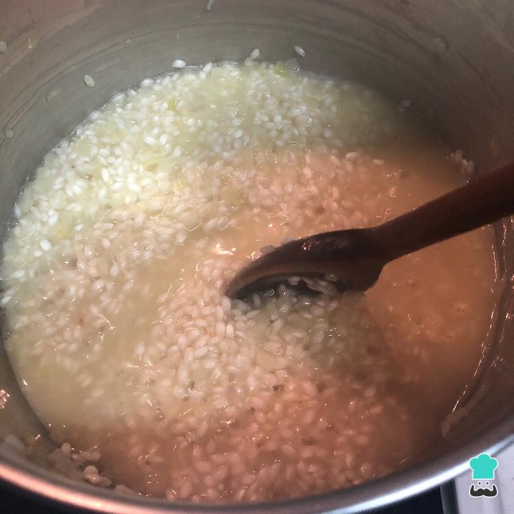 Coloque o vinho branco e vá misturando até o arroz absorver todo o líquido. É importante não parar de mexer o risoto caseiro porque é assim que ele cozinha e fica bem cremoso.