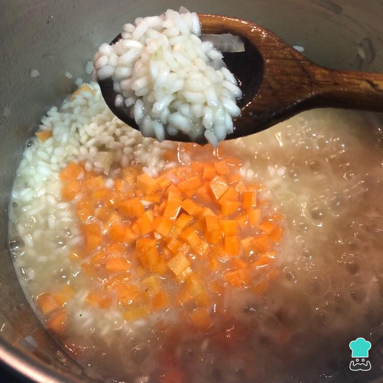 Após adicionar a primeira concha de caldo, coloque cenoura picadinha para cozinhar junto com o arroz. É neste momento que a receita do risoto de legumes com queijo de cabra vai começando a ganhar o sabor gostoso dos legumes.