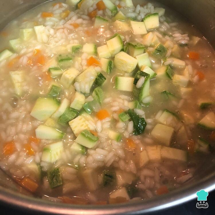 Vá colocando o caldo, concha a concha, sem parar de mexer o risoto. Sempre que o líquido começar a secar, coloque mais uma concha. Finalmente, quando o arroz estiver al dente (depois de uns 20 minutos), adicione a abobrinha picada e o palmito picado. Misture.