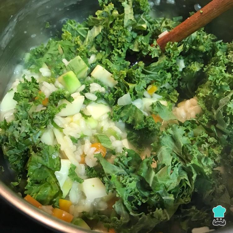 Em seguida, coloque a couve Kale e misture para incorporar. Esta couve é considerada um superalimento porque contém grande teor de ferro, cálcio, fibra e vitaminas A, C e K.