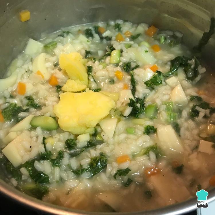 Para finalizar, coloque a manteiga ou manteiga ghee. Assim o risoto ficará brilhante e mais saboroso!