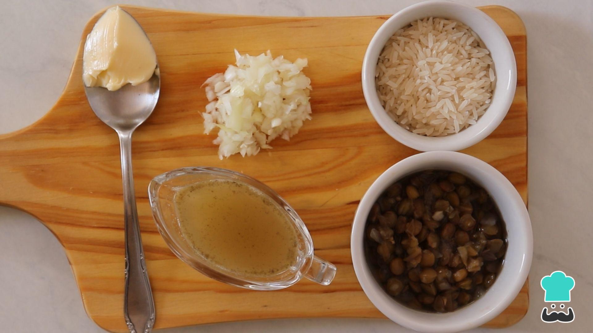 Separe os ingredientes para preparar o seu risoto de lentilha. Pique a cebola e leve o caldo de carne ao fogo. A lentilha já deve estar cozida e escorrida.