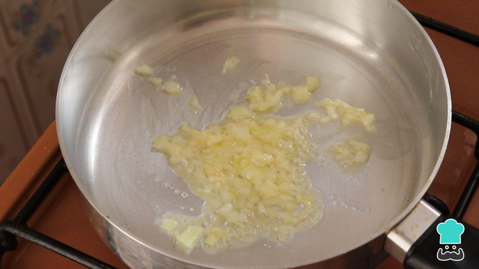 Leve uma panela ao fogo médio, derreta a manteiga e refogue a cebola até ficar translúcida. Adicione uma pitada de sal para ajudar a refogar a cebola.