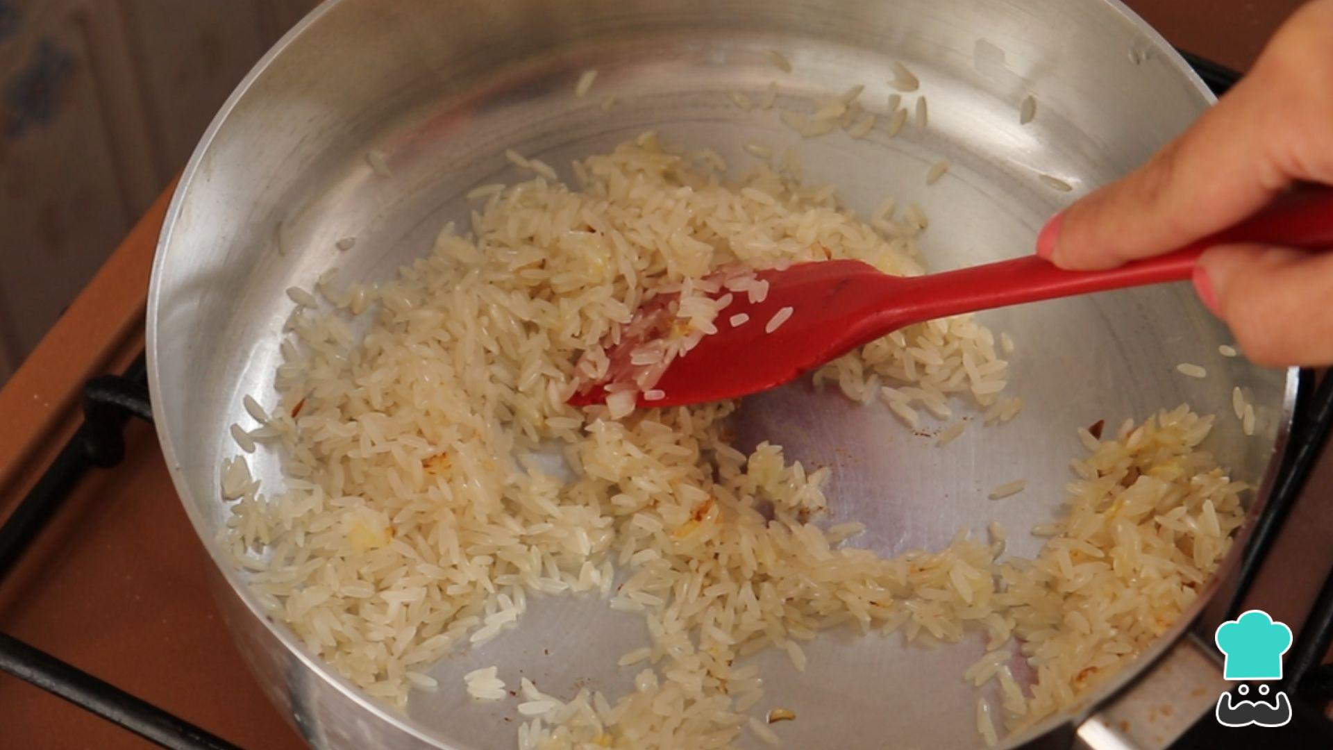 Adicione o arroz e misture bem para ele pegar o sabor do refogado.