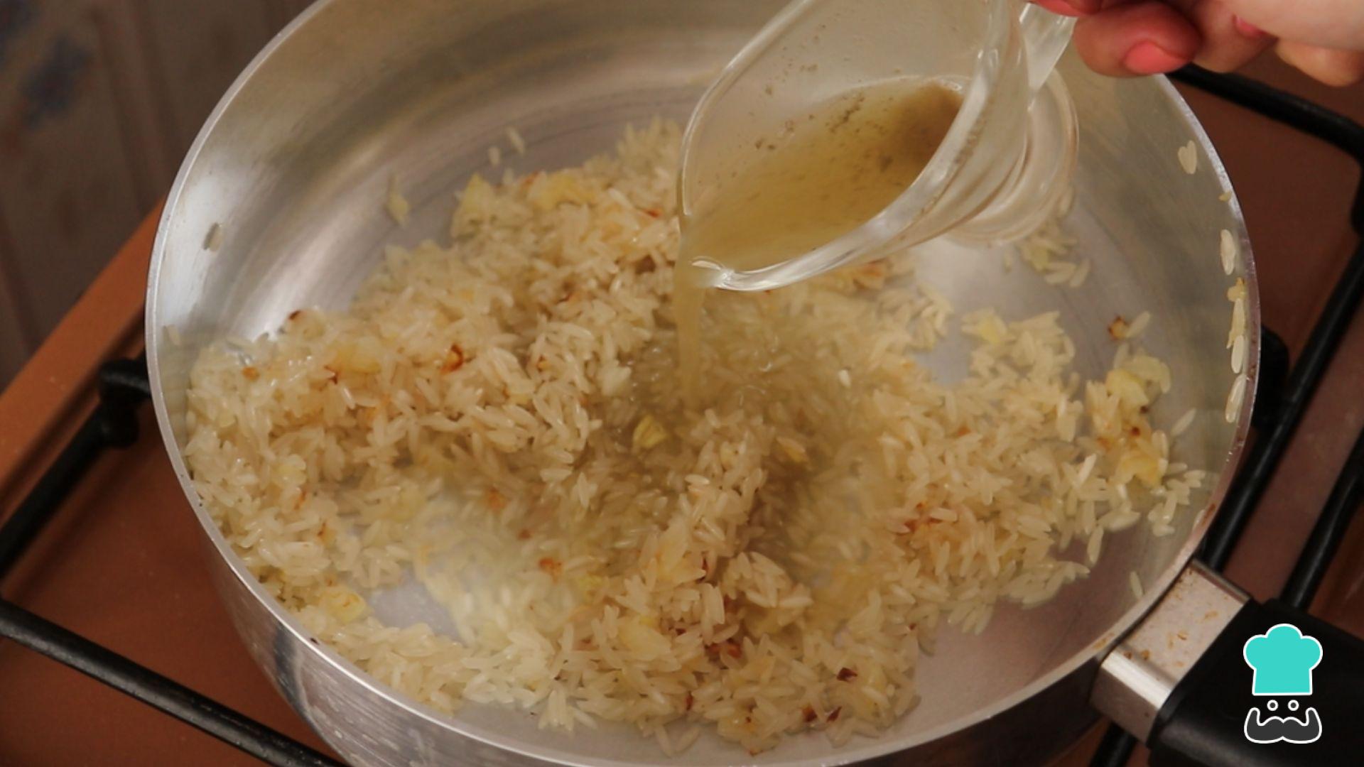 Despeje o caldo de carne (que deve estar sempre quente) aos poucos, repetindo o processo até que o arroz esteja cozido, macio, mas ainda firme.