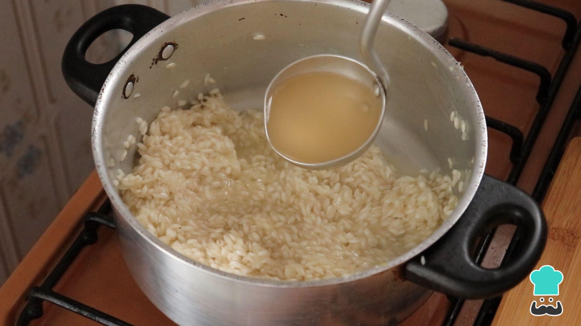 Agora é hora de acrescentar o caldo de legumes e esse processo é feito em etapas: coloque uma concha de caldo e mexa o arroz até o caldo secar, depois repita o procedimento, de concha em concha, até o arroz cozinhar (lembrando que o caldo precisa estar quente!).