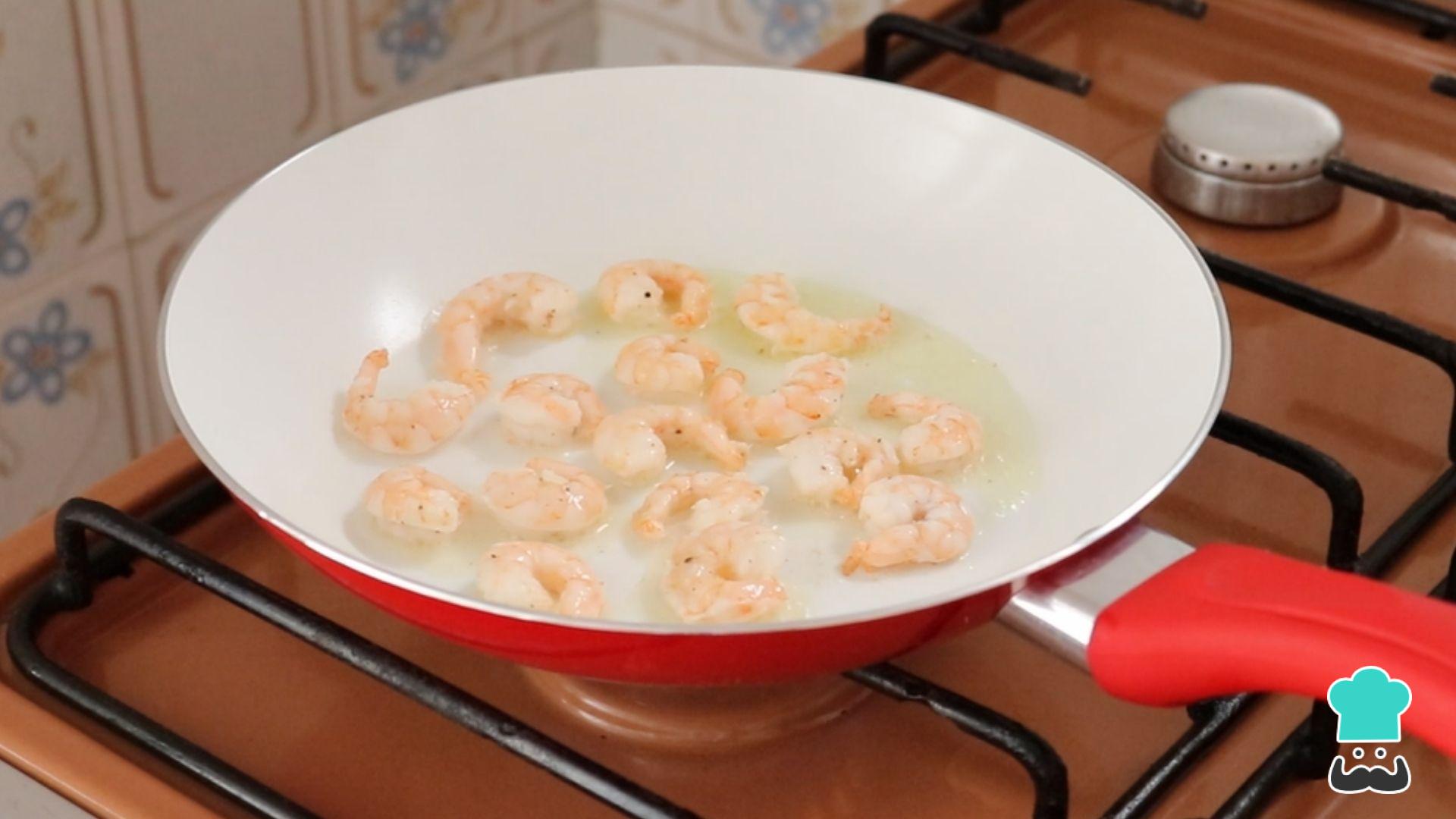 Leve uma frigideira ao fogo médio, coloque uma colher de sopa de azeite e frite os camarões até ficarem dourados. É super rápido, 1 minuto de cada lado. Não frite muito para não ficar seco. Reserve.