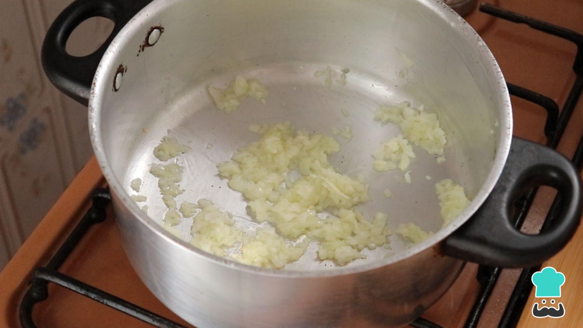 Leve uma panela ao fogo médio, despeje duas colheres de azeite e refogue a cebola. Coloque uma boa pitada de sal.