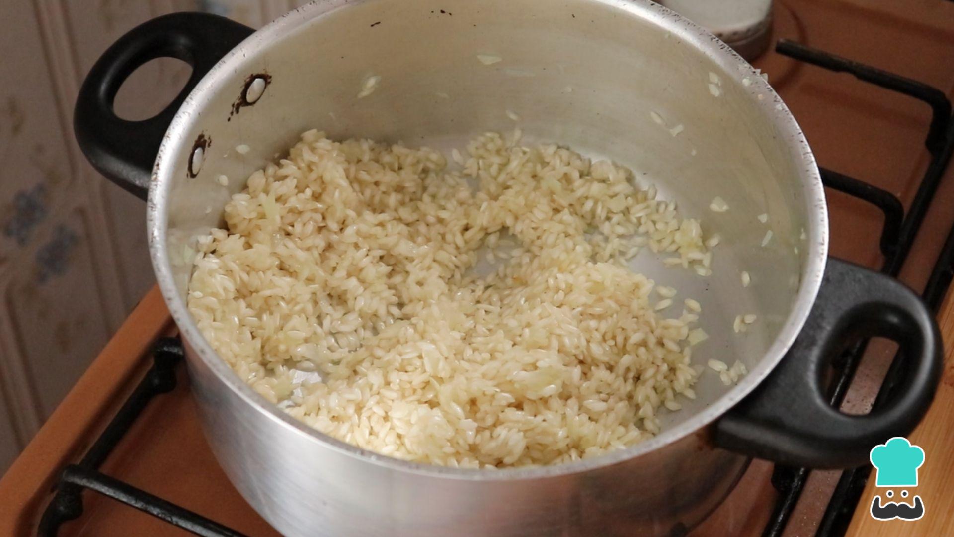 Acrescente o arroz para risoto e misture bem para ele pegar o sabor do refogado.