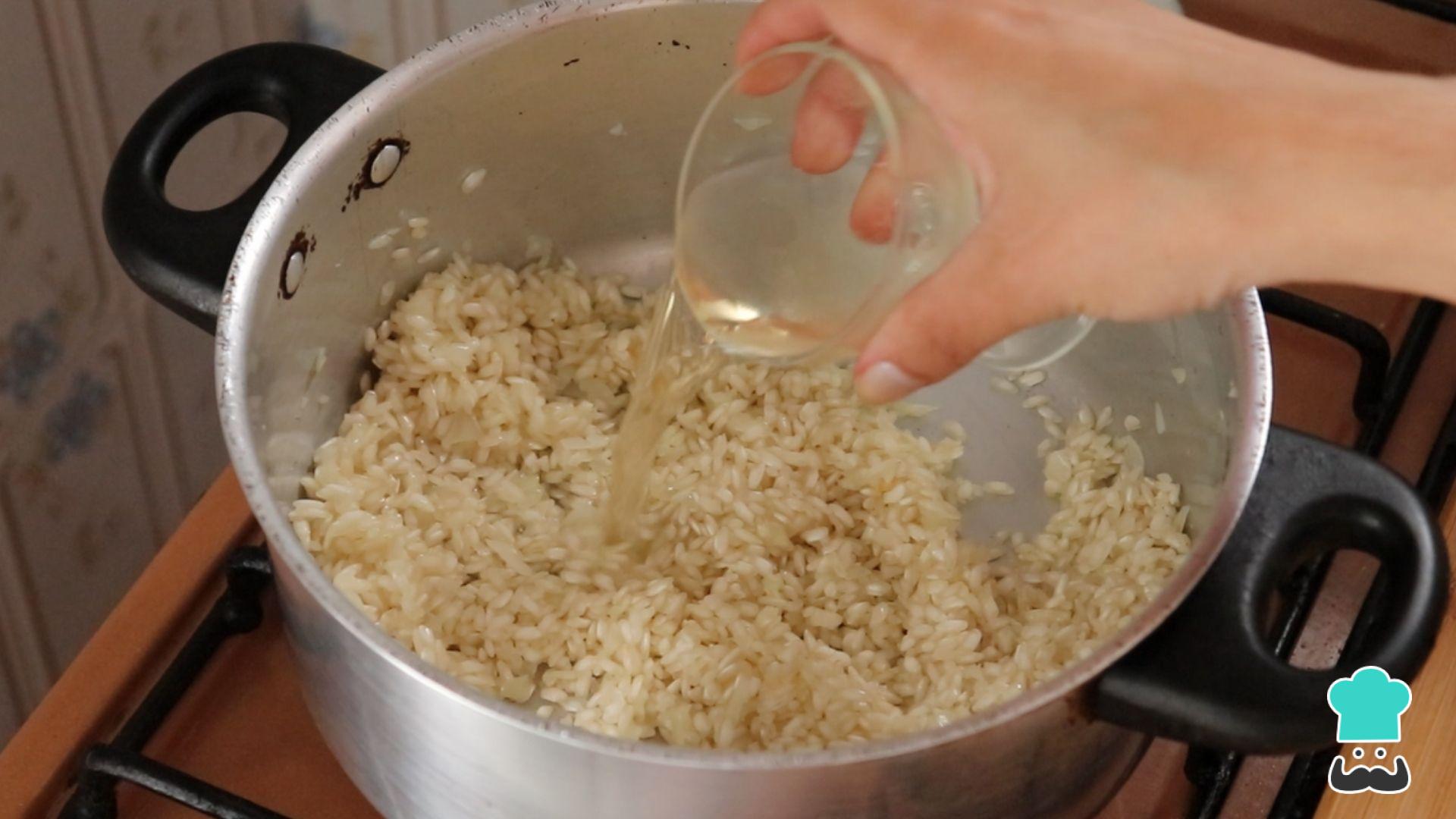 Em seguida despeje o vinho branco e mexa bem até evaporar.